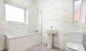 Two-Piece in white comprising of sink and walk-in shower enclosure tiled splashbacks, vinyl flooring, built-In storage cupboard housing boiler, upvc double glazed window, heated towel radiator.