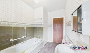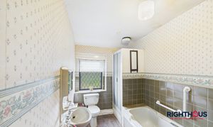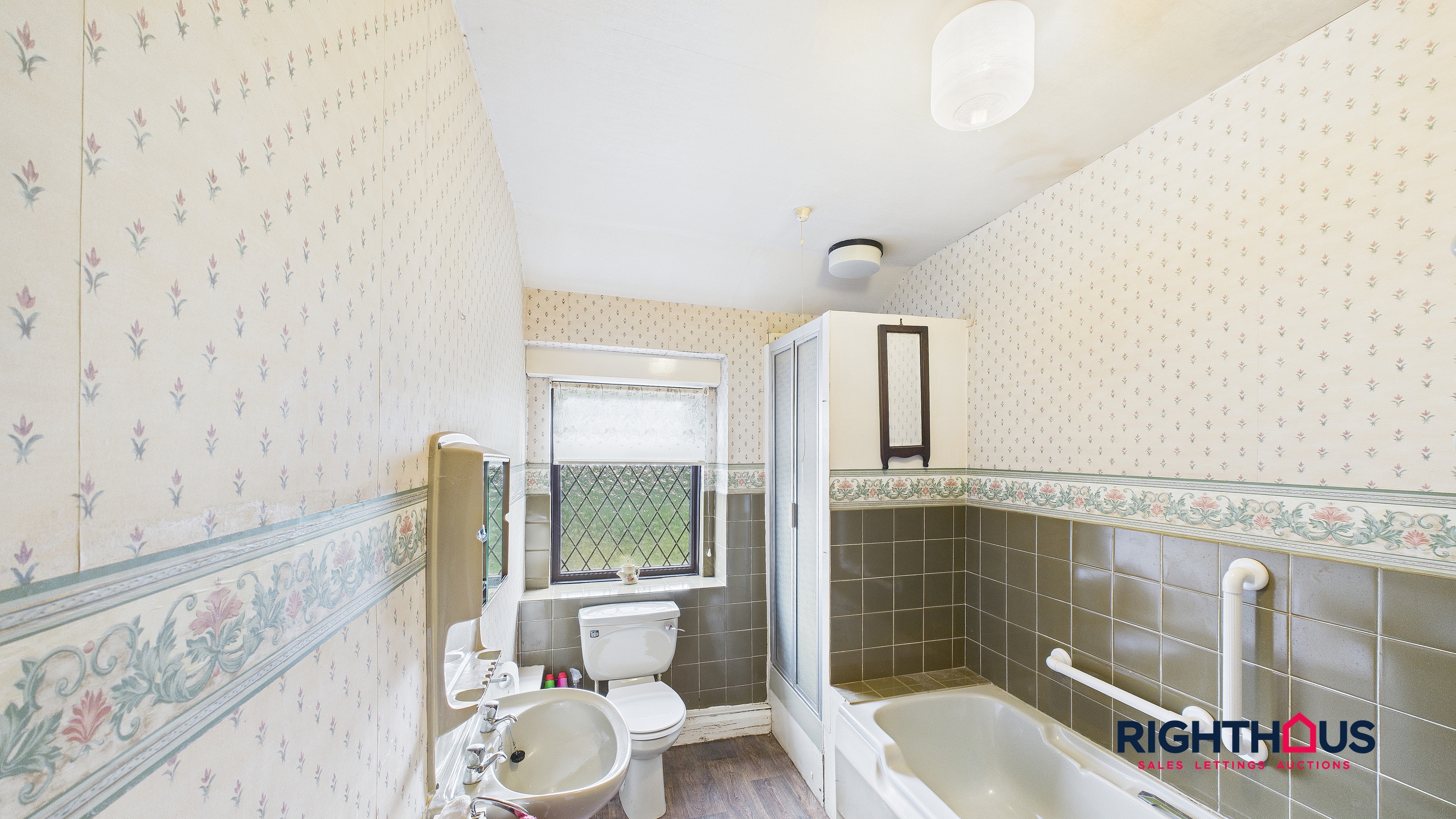 Incorporating a panelled rectangular bath, shower enclosure, w.c and hand wash basin.
