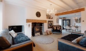 On the first floor the generous dual-aspect master bedroom is bathed in natural light, with a vaulted ceiling, exposed wooden beams, and reclaimed wooden flooring. A feature fireplace adds a touch of character, and the room is further complimented by a radiator and a window to the front. A door leads to the en-suite cloakroom, which has a window to the front, wooden shelving, a wall-mounted basin, and a W.C. The second bedroom is another beautifully presented space, also with a vaulted ceiling and reclaimed wooden flooring. It has a radiator, two Velux windows, and a doorway leading to a second en-suite shower room. The shower room is beautifully decorated, with a glazed shower enclosure, hand-held and overhead shower heads, a WC, and a wall-mounted wash basin. Tiled walls and floors, underfloor heating, and a towel rail complete the room, with a Velux window adding extra light. The third bedroom features a window to the front, reclaimed wooden flooring and a radiator. There’s a luxurious family bathroom too with a Fired Earth jacuzzi bath, tiled surround, a vanity unit with a countertop basin, a towel rail, an obscured window to the rear and a WC.