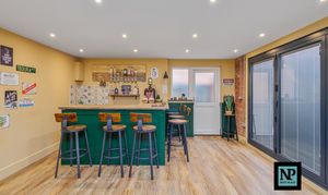 Set well back from the road, the property benefits from a substantial frontage and ample off-road parking for multiple vehicles, complemented by a double garage. The garage has been cleverly adapted, with the rear half converted into a stylish garden bar, while the front section continues to provide valuable storage.