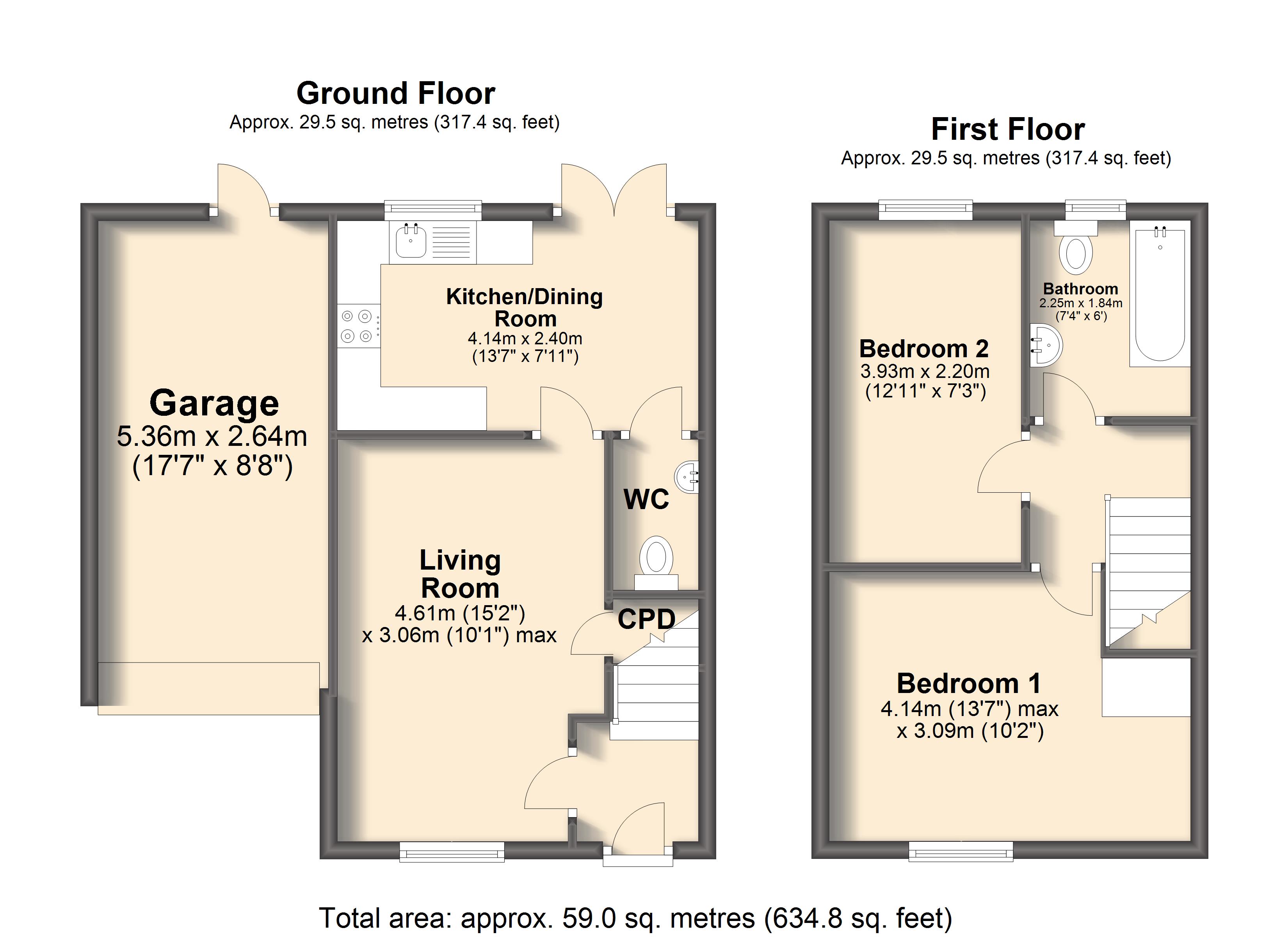 You'll love the layout on the ground floor; an open plan kitchen and dining area offers a range of integrated appliances and doors opening out onto the good-sized rear garden. A further generous living room enhances the ground floor accommodation with a downstairs w/c and storage. Two double bedrooms are set on the first floor, both offering plenty of space for stand-alone and fitted furniture accompanied by a bathroom with a three-piece suite. To the rear is a generous-sized garden; enclosed, it provides a lawn, patio area and a pond; it's an ideal space for entertaining friends and family with plenty of room for children to play. Off-road driveway parking is located at the front with a single garage including access from the garden.