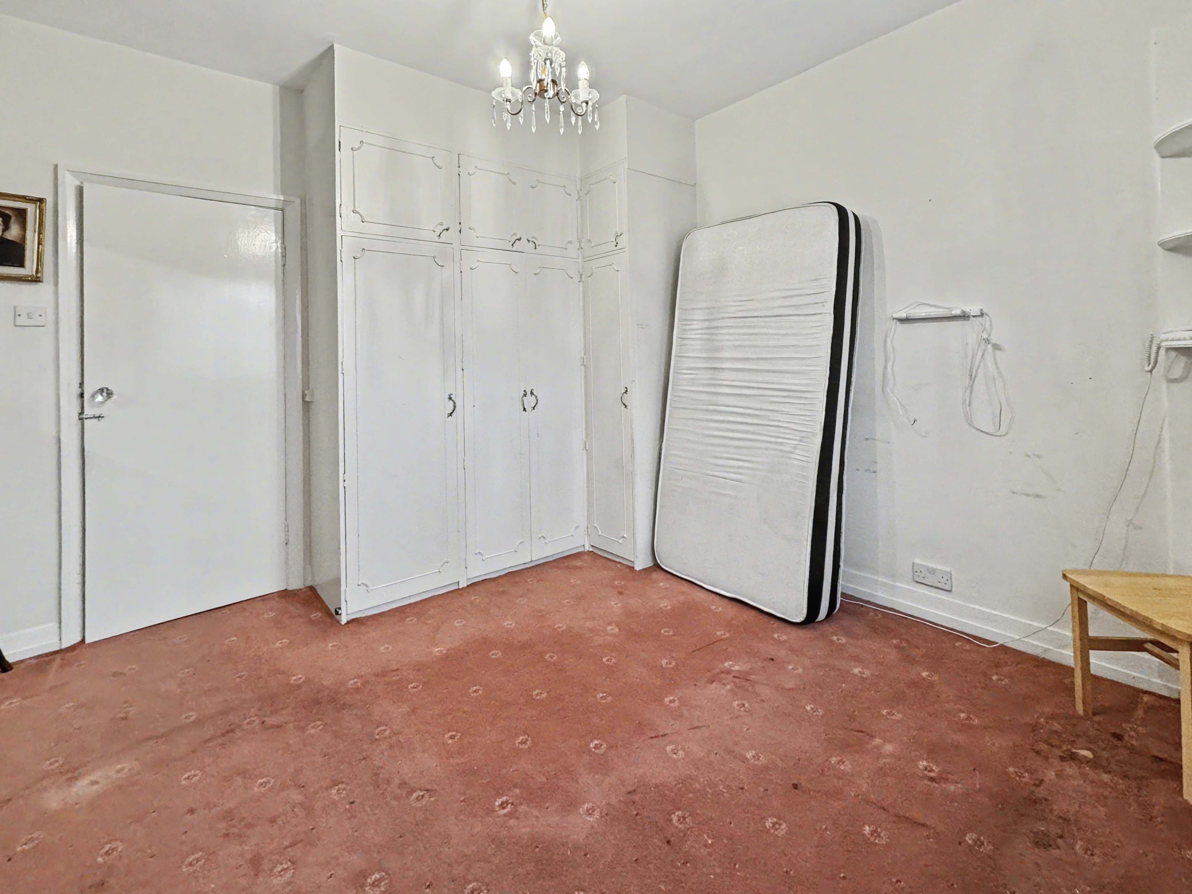 Both bedrooms are well-sized doubles positioned to the front of the property, each benefitting from fitted wardrobes and matching dressers. The main bathroom is accessed via a Jack and Jill arrangement, fitted with a white suite comprising a bath with overhead shower, washbasin and WC, and finished with tiled walls and flooring and a frosted window. In addition, there is a separate WC with washbasin and space and plumbing for a washing machine, adding further practicality.