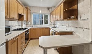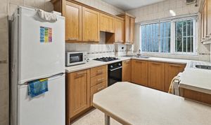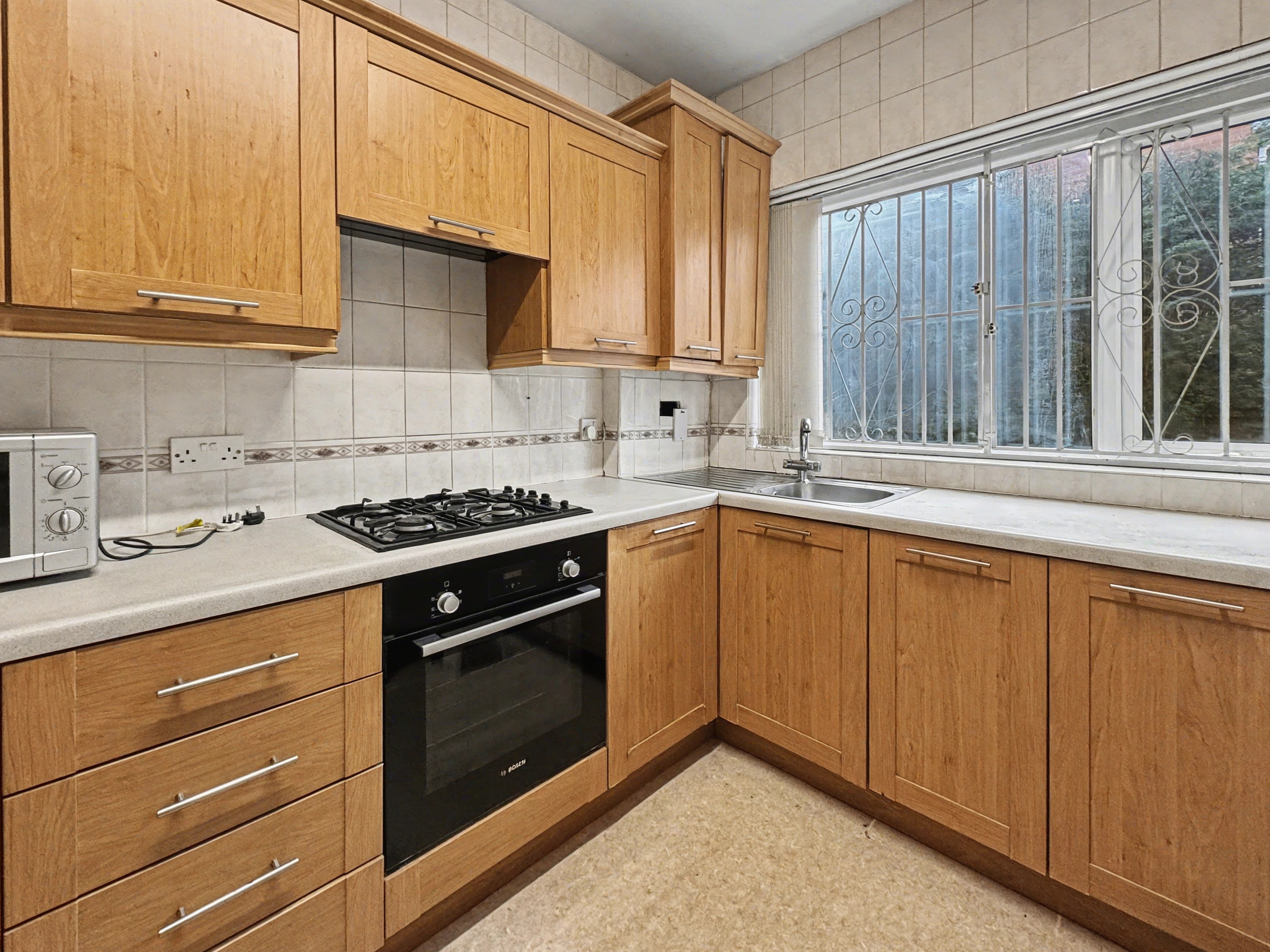 The fitted kitchen adjoins the living area and features a range of wall and base units, inset sink units with mixer taps, an integrated oven with four-ring hob and extractor hood, along with space for a fridge/freezer and dishwasher. A breakfast bar offers casual dining, while tiled walls, a side-facing window and access to the inner hallway complete the space.