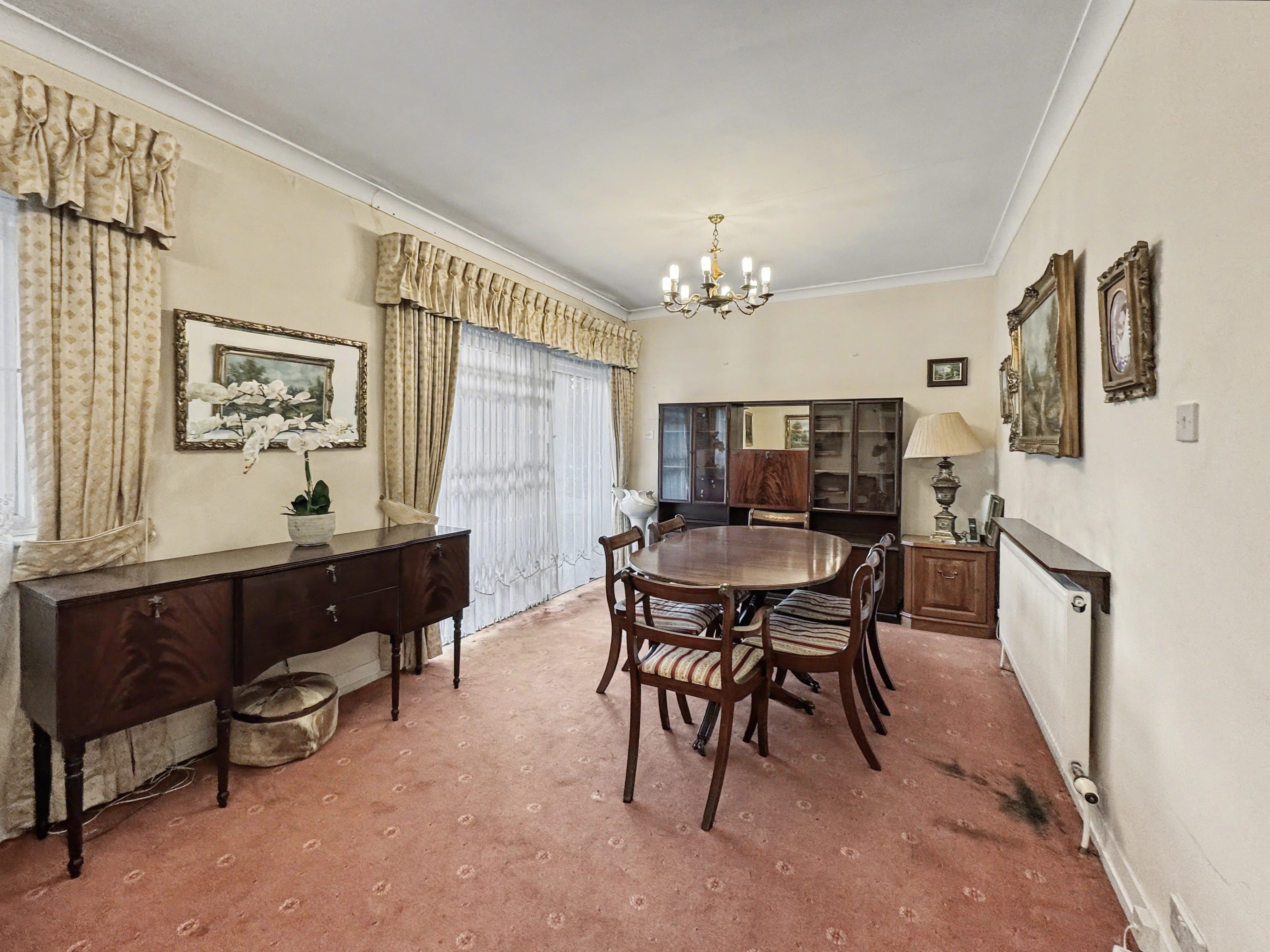 Accessed via a secure intercom-controlled communal entrance, the apartment opens into a welcoming hallway with panelled doors leading to all rooms, a useful storage cupboard, and double part-glazed doors opening into the main living space. The lounge and dining area is generously proportioned and thoughtfully laid out, providing ample space for both relaxation and entertaining. The room flows naturally from a comfortable seating area into a dining space, with patio doors opening onto a rear-facing balcony that enhances the sense of light and connection to the outdoors.