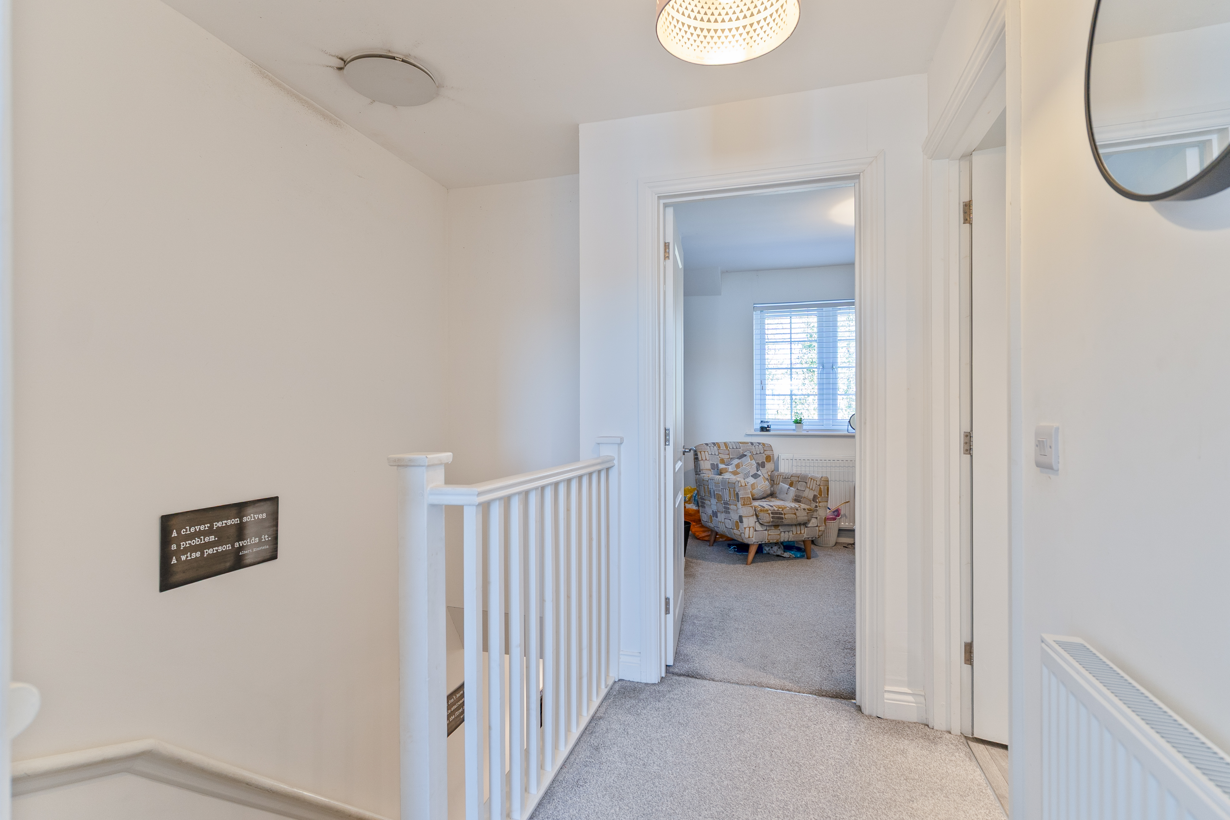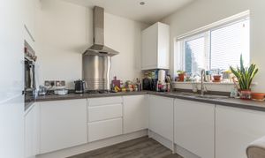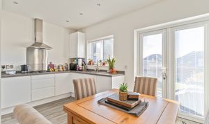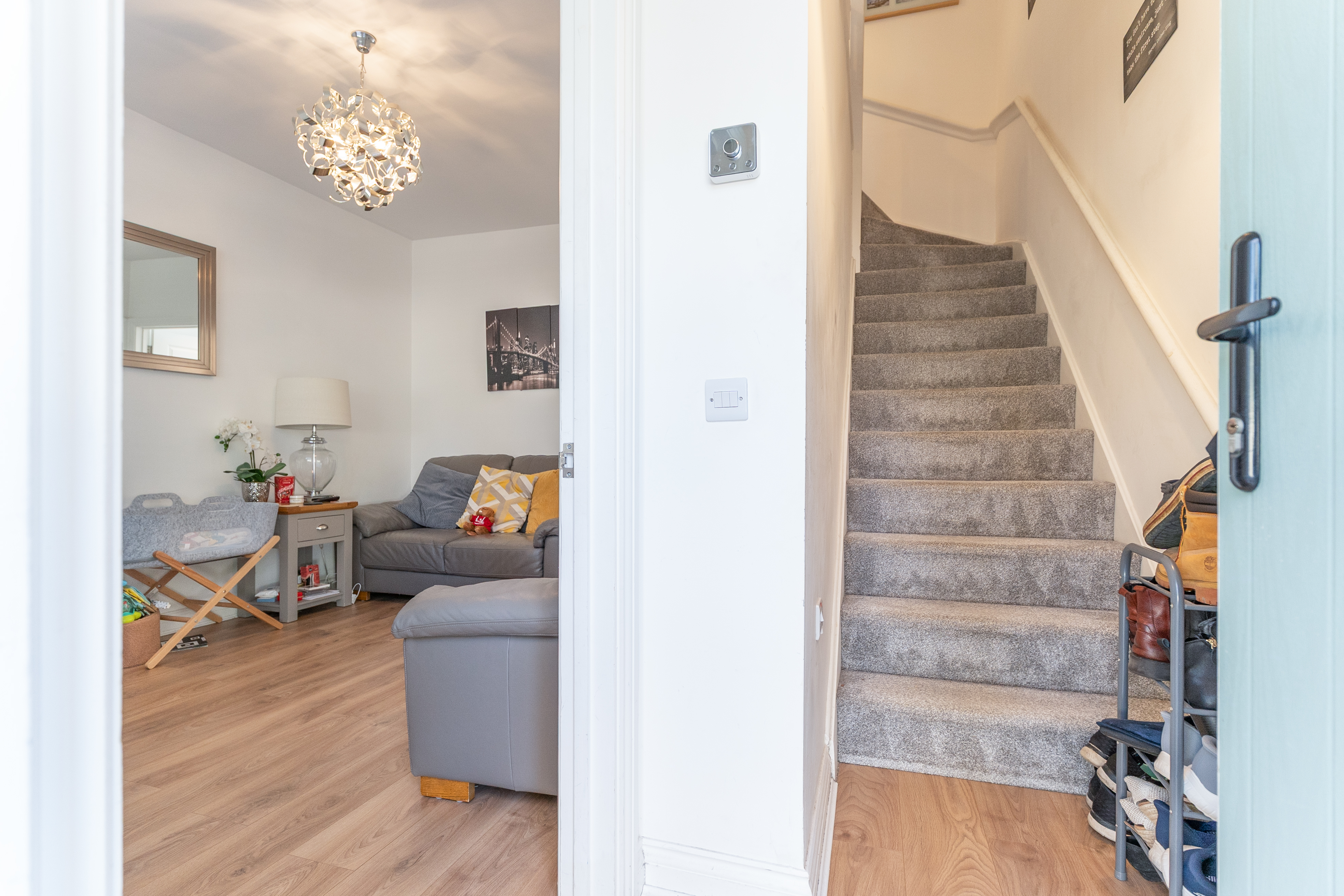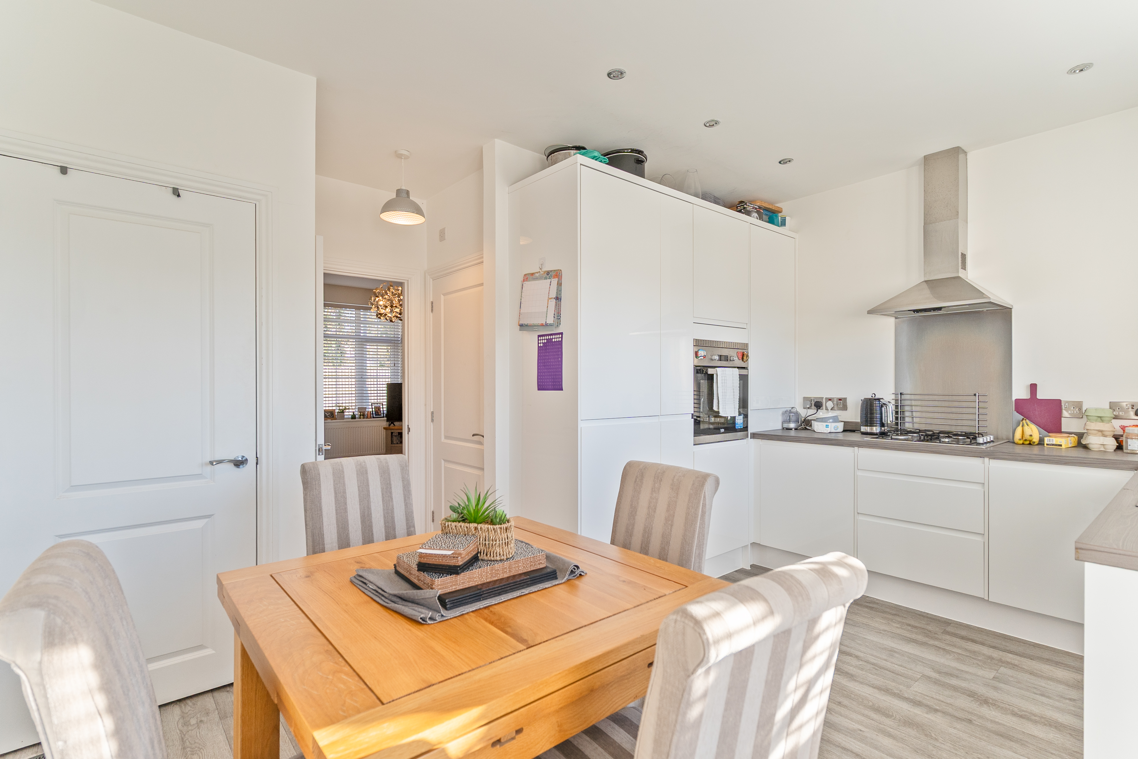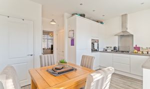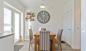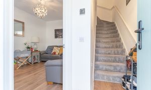 On the ground floor, you enter through an initial hall space, with stairs ahead leading up to the first floor and the main living room positioned to the left. The living room is bright and tastefully decorated in a neutral palette, creating a calm and inviting space for relaxing or entertaining. To the rear of the property is the open-plan kitchen/diner, featuring a modern fitted kitchen with built in appliances including fridge freezer, oven, hob and dishwasher. Along with ample unit and worktop space, and room for a dining table. This sociable layout benefits from patio doors opening directly onto the rear garden, allowing natural light to fill the space. From the kitchen area, you also have access to a convenient cloakroom and a useful utility cupboard, which has space for a separate washing machine and tumble dryer, adding practicality to daily life.