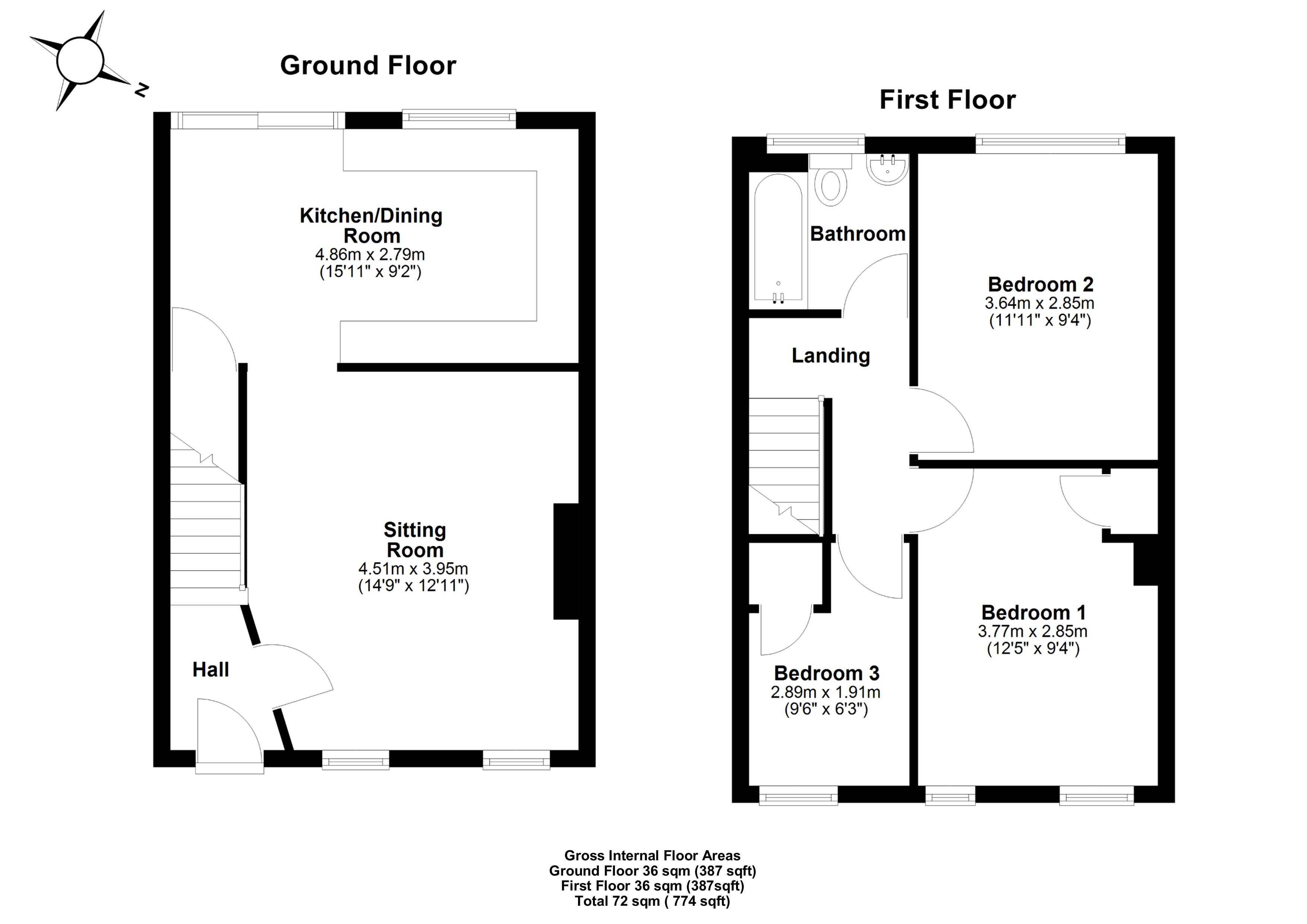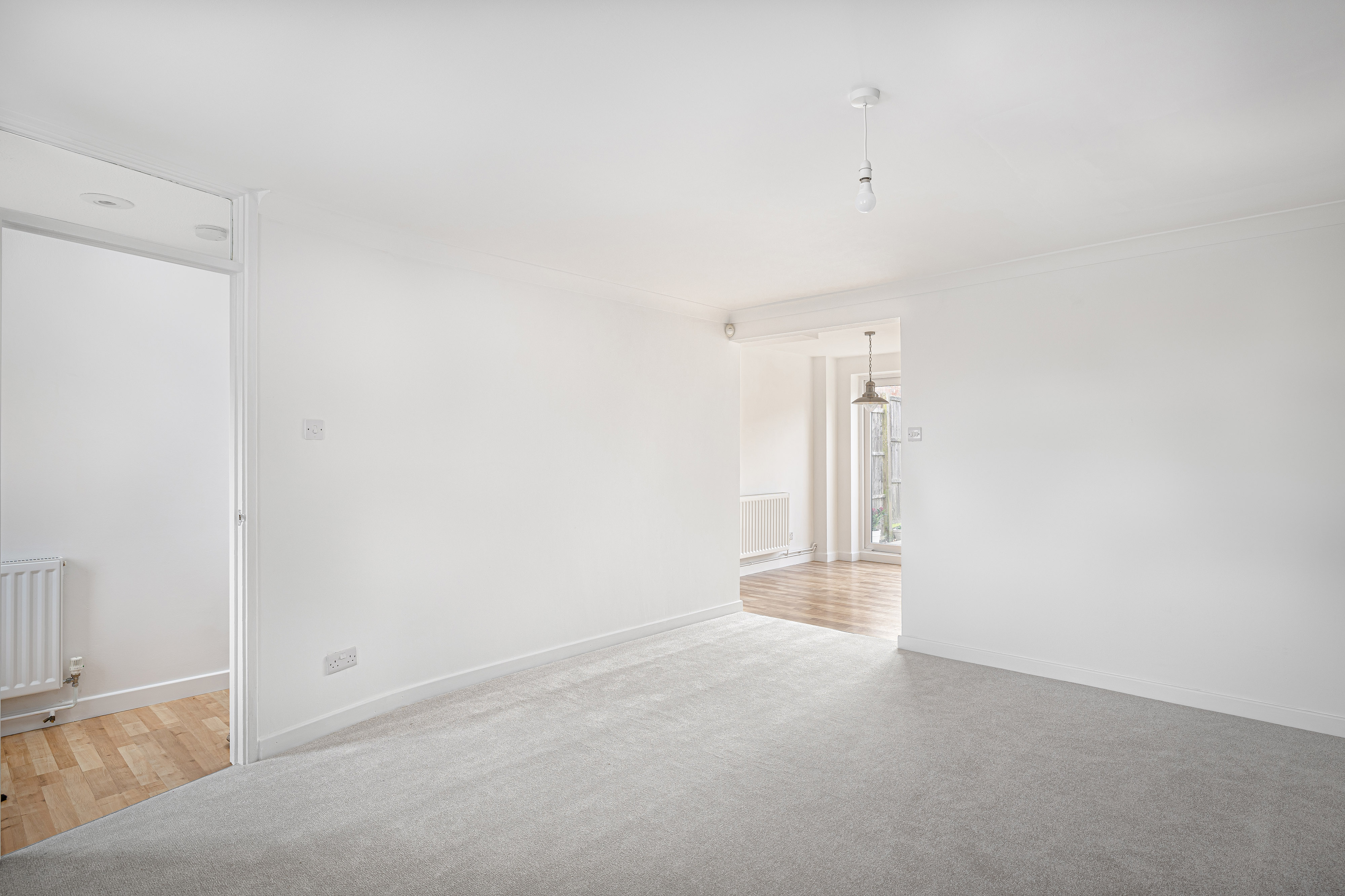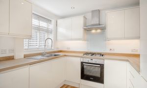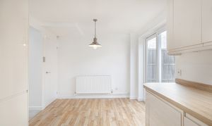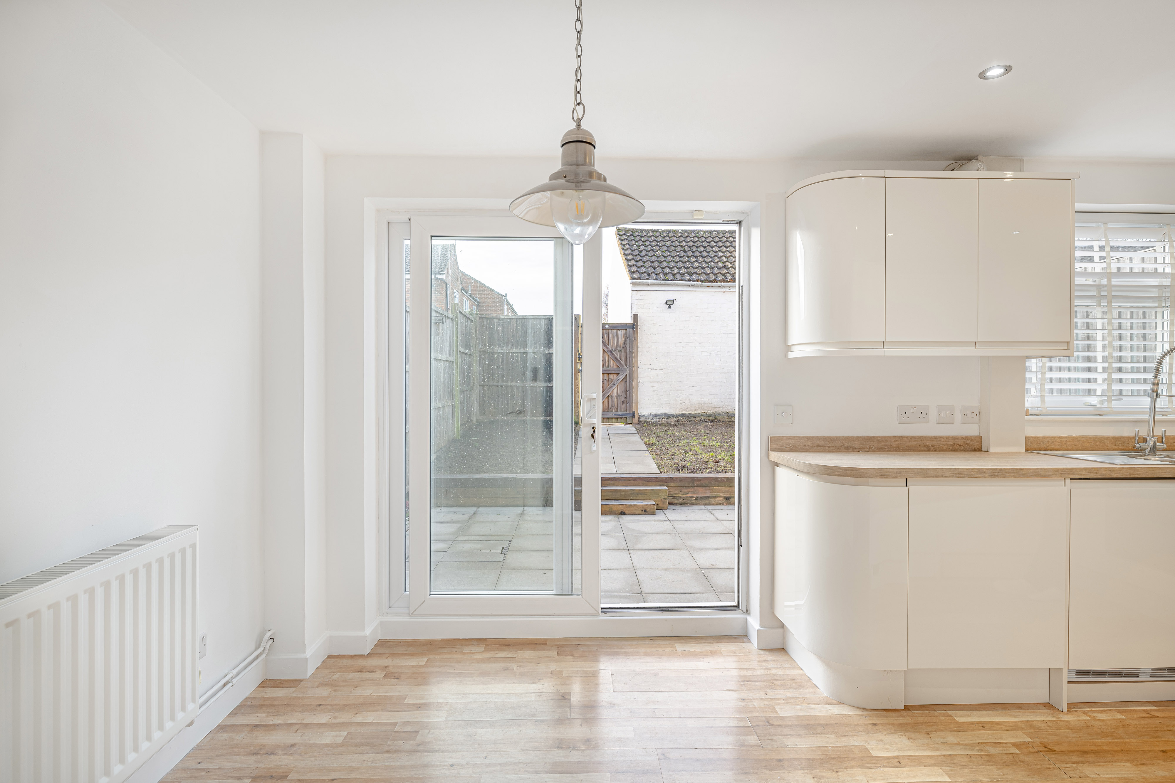 Light, modern and freshly decorated throughout, the accommodation extends to approximately 774sqft and offers a practical and sociable layout. A generous sitting room occupies the front of the house, featuring twin windows that draw in excellent natural light and a chimney breast that adds personality and warmth to the space. From here, the room opens through to a superb kitchen/dining room, finished in sleek high-gloss cabinetry with wood-effect worktops, integrated appliances and stylish lighting. Sliding doors span the rear elevation, connecting directly with the garden and allowing the space to work effortlessly for everyday living, children, entertaining or summer dining.