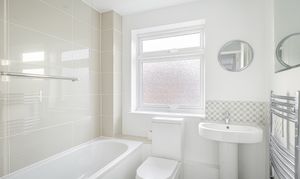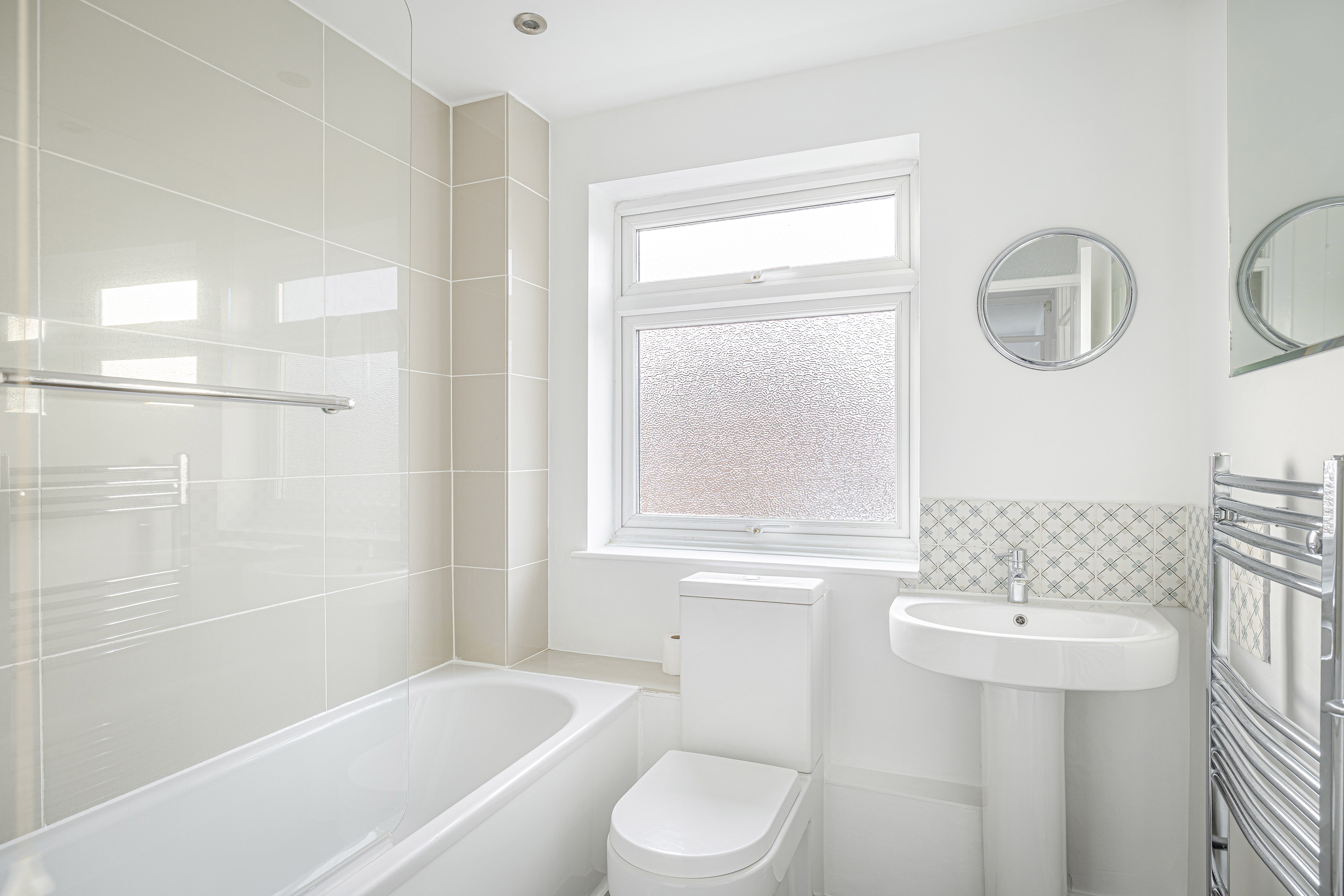 Upstairs, there are three bedrooms, two comfortable doubles and a well-sized single, ideal for a nursery, guest room or home office. The bathroom is modern and bright with quality tiling, a shower-over-bath, chrome towel rail and contemporary fittings.