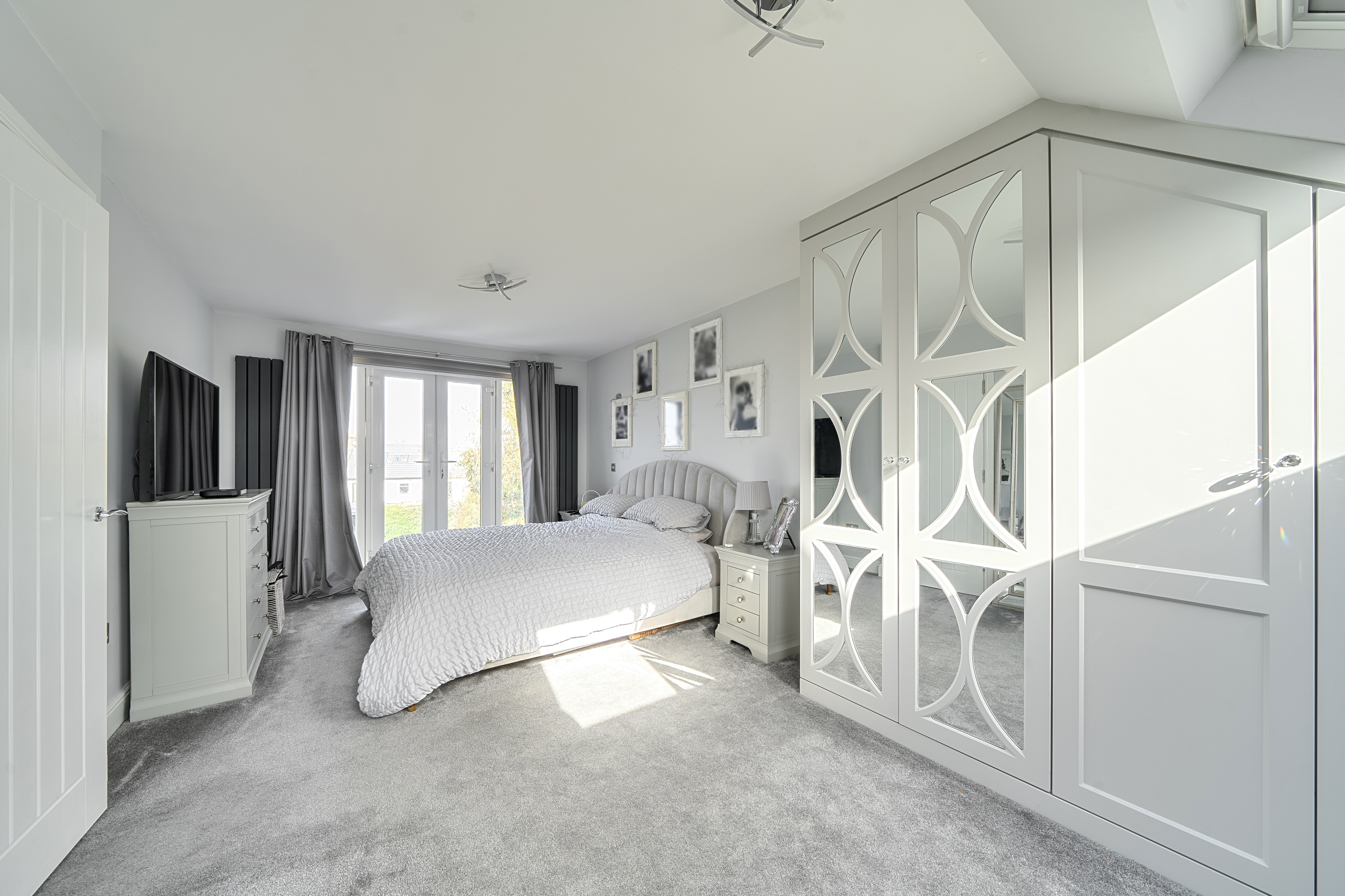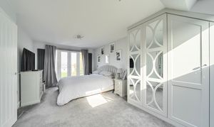 Inside, you are welcomed by a generous entrance hall leading to a bright, open plan kitchen diner, thoughtfully designed for modern living and entertaining, with sleek bifold doors that draw in natural light from the west. The kitchen is fitted with high-specification appliances and ample storage. The ground floor also features a spacious living room, ideal for relaxing evenings, and a downstairs W/C.