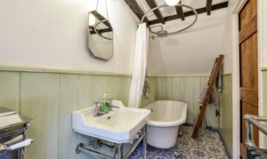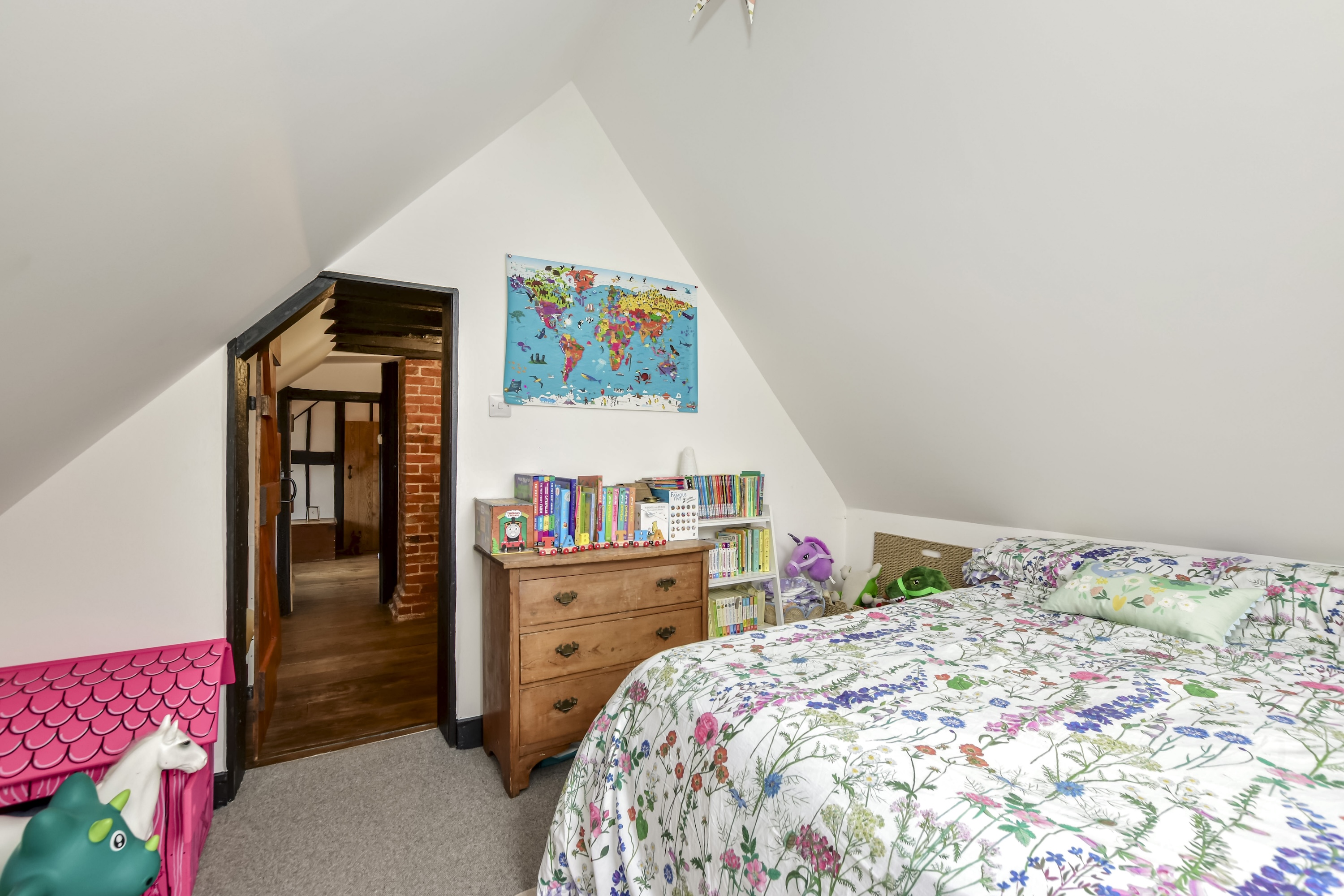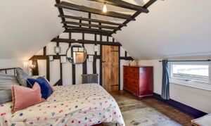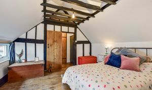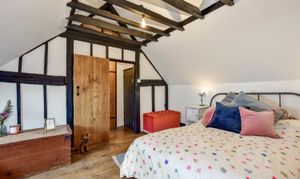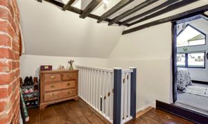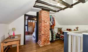 Separate staircases lead to the first floor, where there are 2 double bedrooms, both with vaulted ceilings. The main bedroom is an especially large room with antique oak floorboards and an array of original exposed beams. Both bedrooms are served by a tastefully fitted family bathroom and there is also a central study area. Interconnecting doors ensure the house flows naturally.