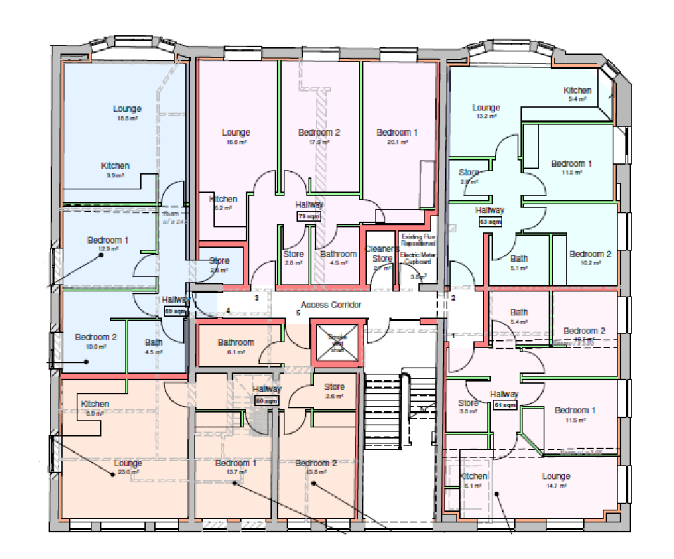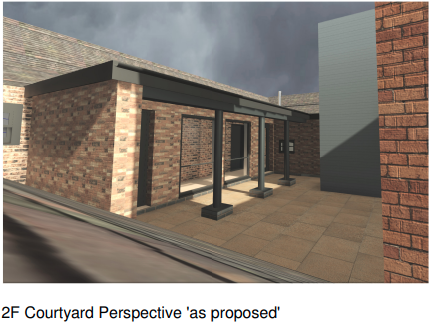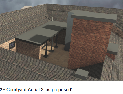 The approved scheme will re-purpose the upper floor space for residential use, incorporating a ground-floor entrance hall, stair enclosure, required circulation corridors, and shared access to a flat rooftop courtyard amenity space.