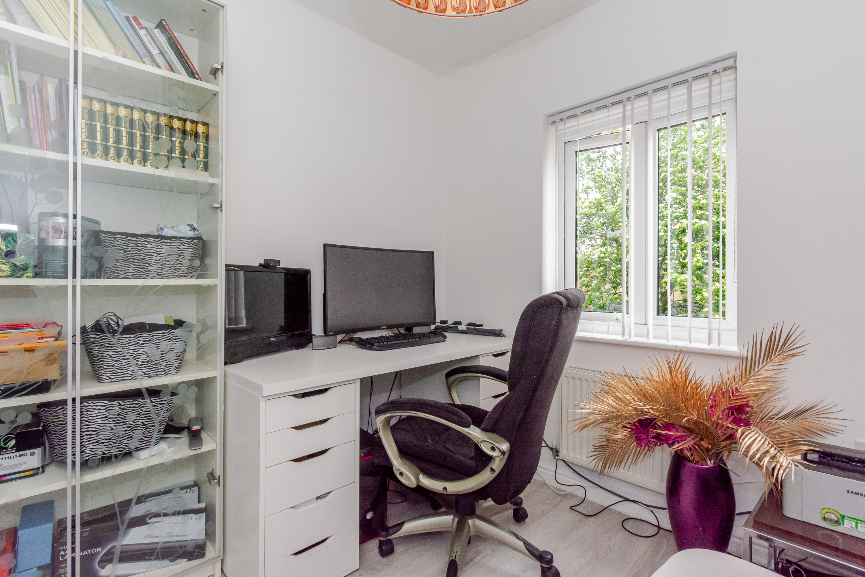 With timber panelled and bevelled glass door with adjacent bevelled glass window, there is a pvcu double glazed window looking out over the rear garden, ceiling light point, central heating radiator and grey laminate flooring.