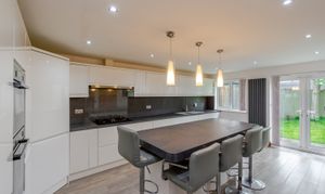 This has composite panelled and double glazed door giving access to the rear garden, vertically hung radiator, grey plank effect laminate flooring, extractor fan and fitted with white gloss handle less base and wall cupboards, drawers, these are complimented by contrasting overlying worktops with matching splash backs, there is an inset sink with extending chrome monobloc tap, four ring induction hob with extractor hood over and integrated pull out bin, with waste disposal unit.
