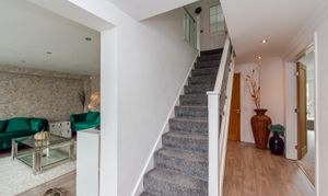 Entrance hall with a composite panelled and frosted double glazed door, inset led down lighters, ceiling coving, two vertically hung radiators, grey plank effect laminate flooring and to one side a glass panelled staircase rises to the first floor. From the hallway access can be gained to the following rooms..-