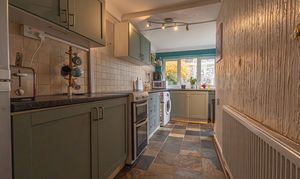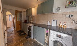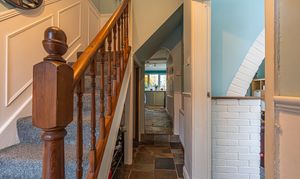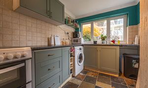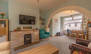 This attractive two-bedroom terraced house offers an inviting blend of classic charm and modern living, with the traditional brick façade and an arched porch providing us with a warm welcome into the property. Inside we arrive at the heart of the home, with two spacious reception rooms that seamlessly connect through an airy open-plan arrangement. Large windows to the front and rear flood the room with natural light, creating a warm and bright atmosphere that is perfect for relaxing, dining, and entertaining guests. Continuing through the house we have the kitchen, which features a practical, user-friendly design, with stone tiling and multiple storage fixtures, and plenty of room for appliances to be added. Additional storage can be found under the staircase in the welcoming entry foyer.