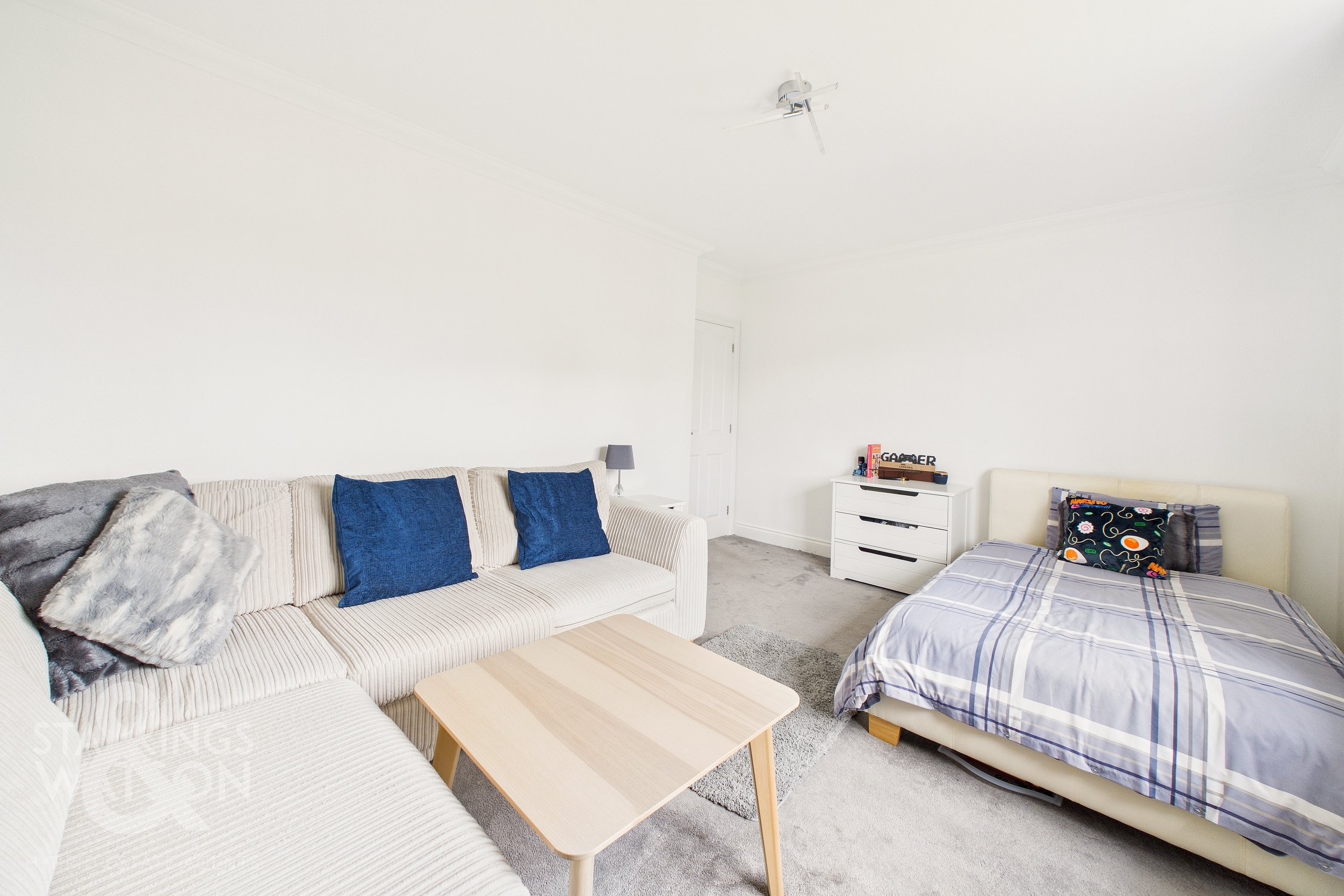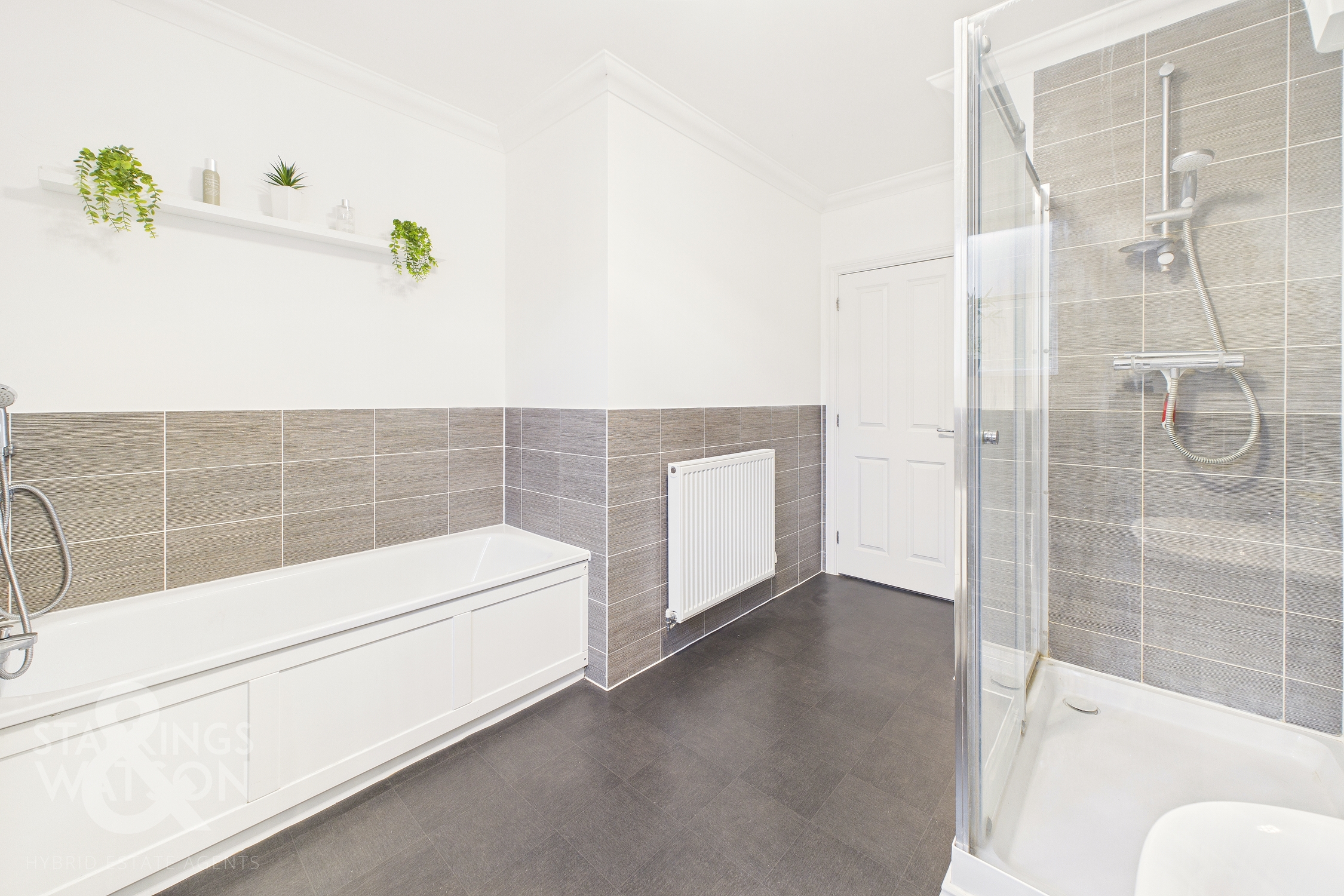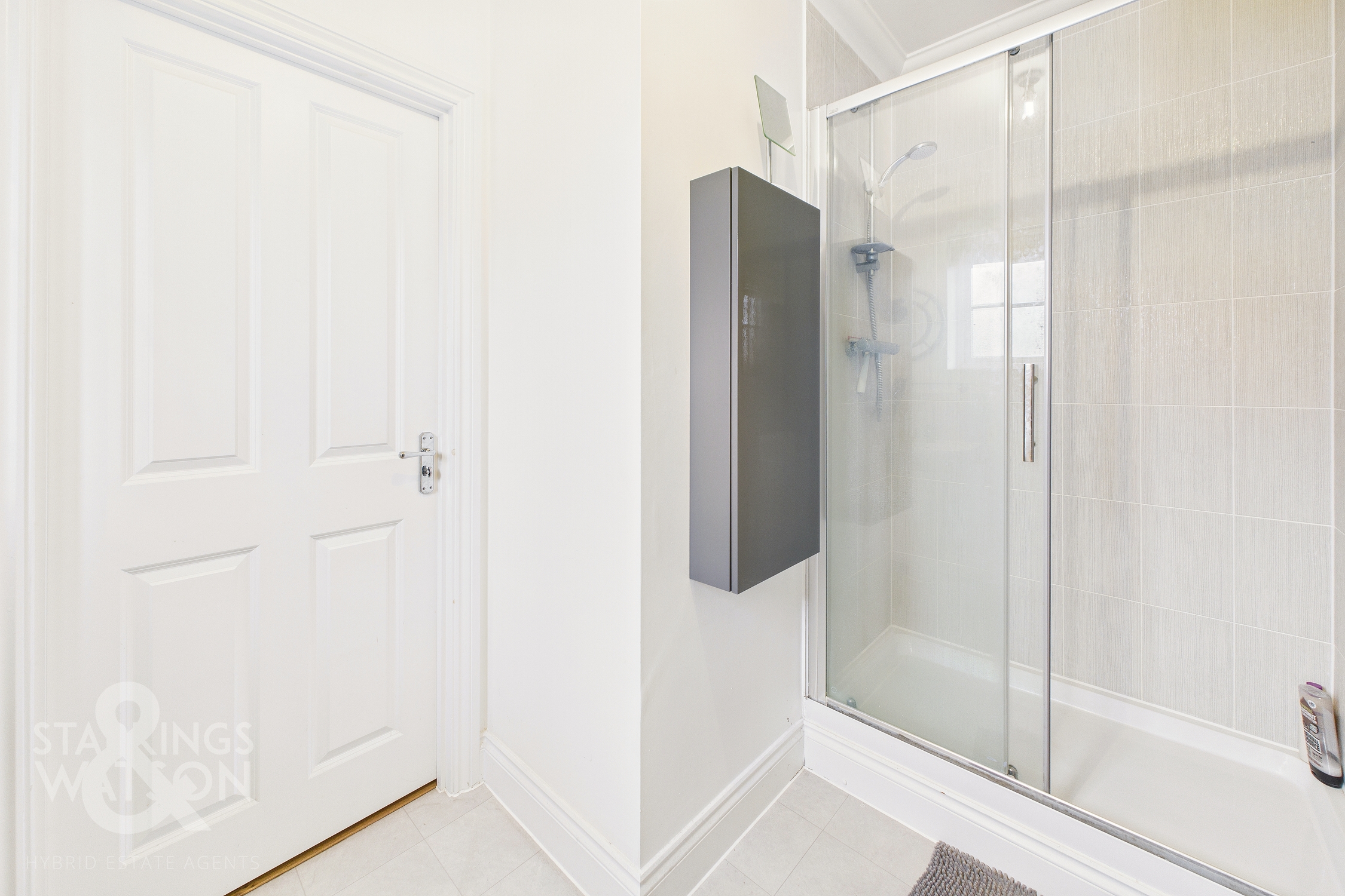 The first floor landing and stairs are finished with newly laid carpets and splits in both directions to take you into all bedrooms within the home. Directly ahead as you round the stairs is a smaller bedroom still more than large enough to accommodate a double bed. This space is fronted by uPVC double glazed sash windows and laid with carpeted flooring whilst a similarly sized bedroom sits just to the side of this, again currently used as an additional storage space but ideal to be used as a large single or potential double bedroom. The first of the larger double bedrooms sits between these two with open carpeted floor space more than large enough to accommodate a double bed with additional soft furnishings and storage solutions. The first of the principal bedrooms sits at the adjacent side of the home. This room is laid with wood effect flooring and overlooks the private rear gardens with the added benefit of a double built in wardrobe and an ensuite shower room complete with vanity storage and wall mounted radiator. Sat just next to this is the four piece family bathroom suite again complete with a predominantly tile surround. This generously sized and well decorated space features a double shower, bath, vanity storage and large radiator. The main bedroom sits just off to the side of this and impressive main suite where a 16’×16’ bedroom is immaculately presented with large open floor space suited for a potential choice of layouts. Multiple built in storage spaces come within this room whilst a secondary hallway takes you towards even further storage. To the right of this hallway is a four piece ensuite bathroom complete with a part vaulted ceiling and a low level radiator whilst an incredibly versatile space sits at the very end of this hallway ideal to be turned into a walk in wardrobe, potential home office setup or nursery for expecting families.