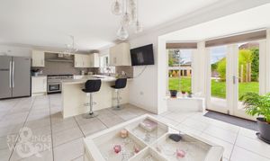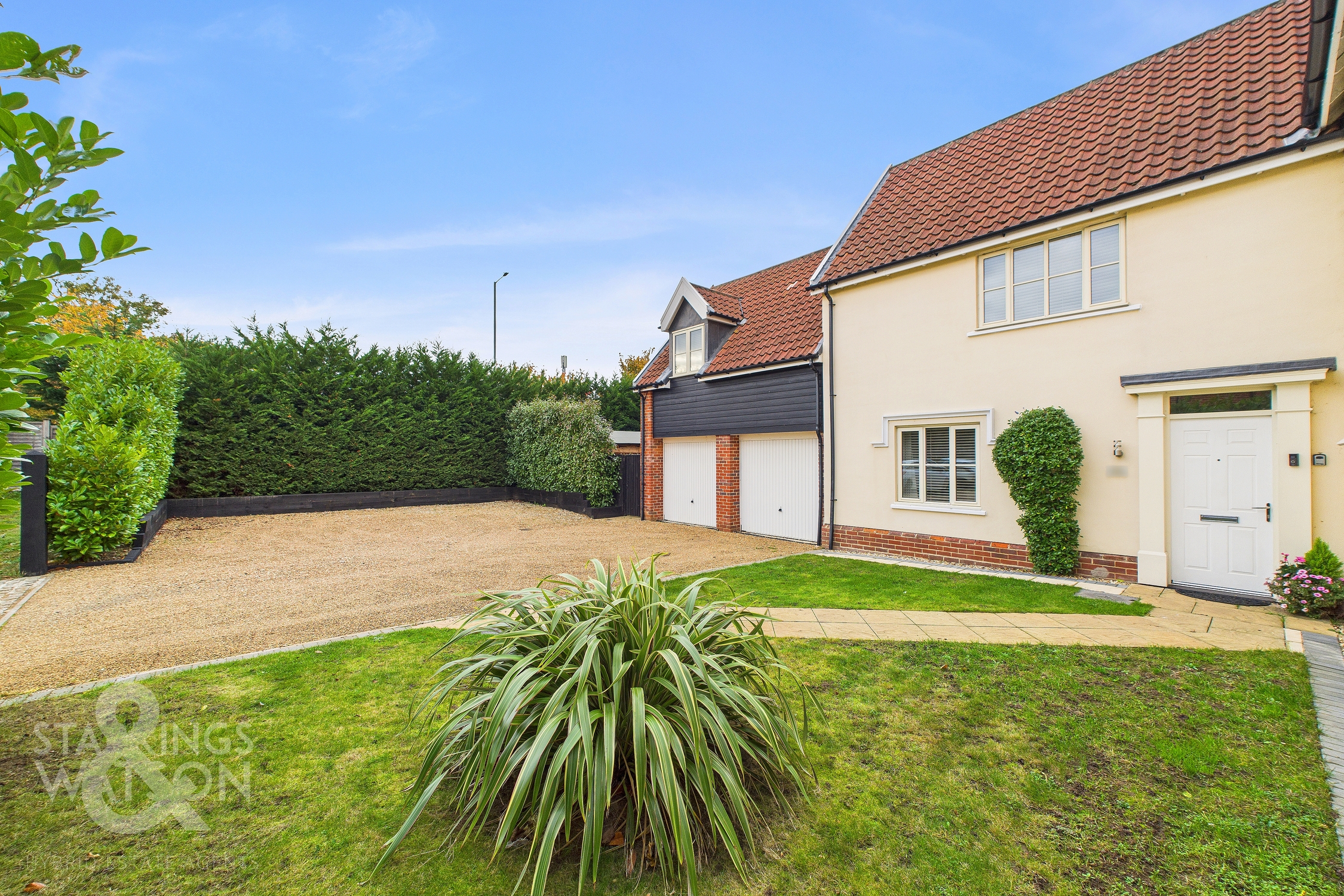 The property is found in a tucked away section on the very edge of this popular family development. Tall mature laurel hedges create a privacy barrier at the front of the home whilst an opening allows for access to the sweeping shingle driveway giving parking for multiple vehicles. A side access gate comes to either end of the home granting access to both the side and rear gardens and with double integrated garages sat within this space too.