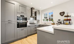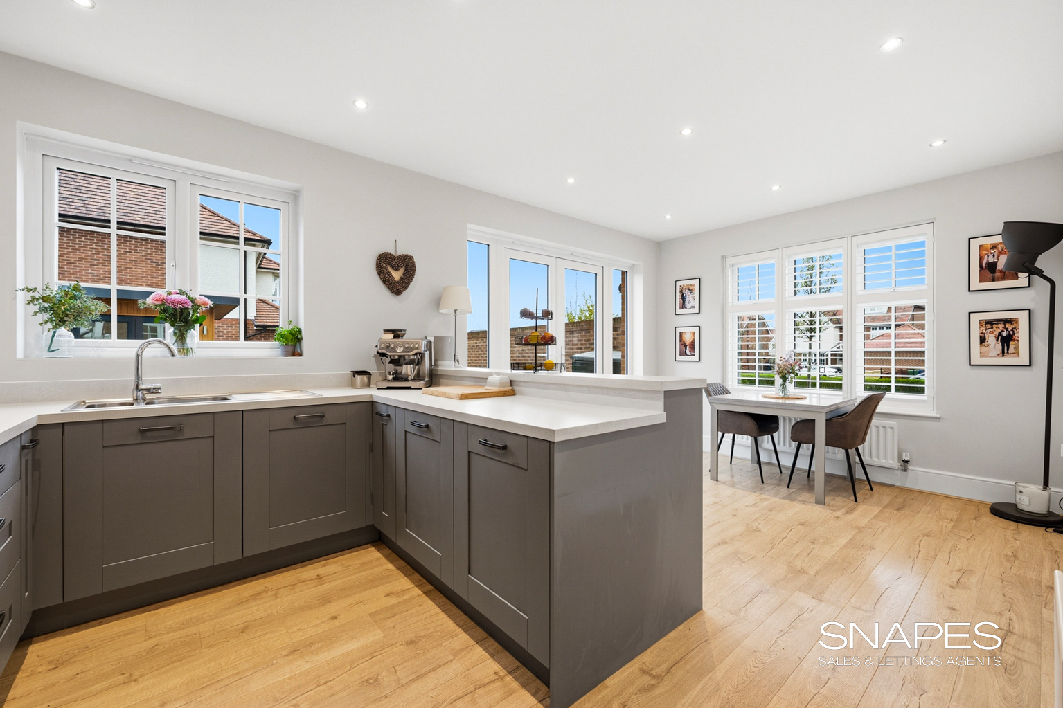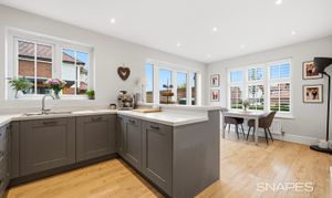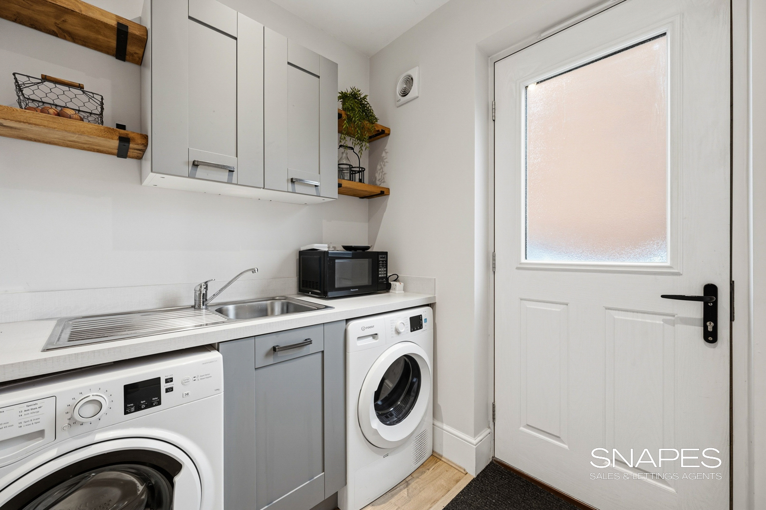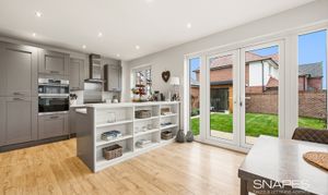 The open-plan kitchen and dining area forms the heart of the home—perfect for both everyday living and entertaining. The kitchen is fitted with an extensive range of modern units, offering a well-designed and highly functional space, with ample room for dining and more informal seating if desired. A separate utility room further enhances practicality, keeping laundry and household tasks neatly separate from the main living areas.