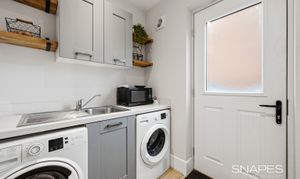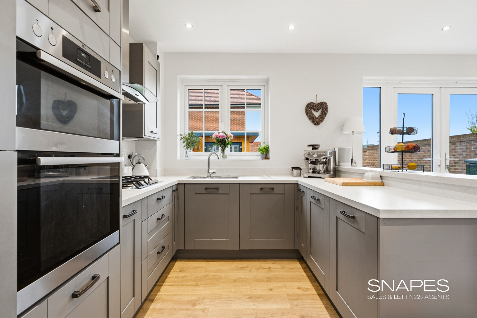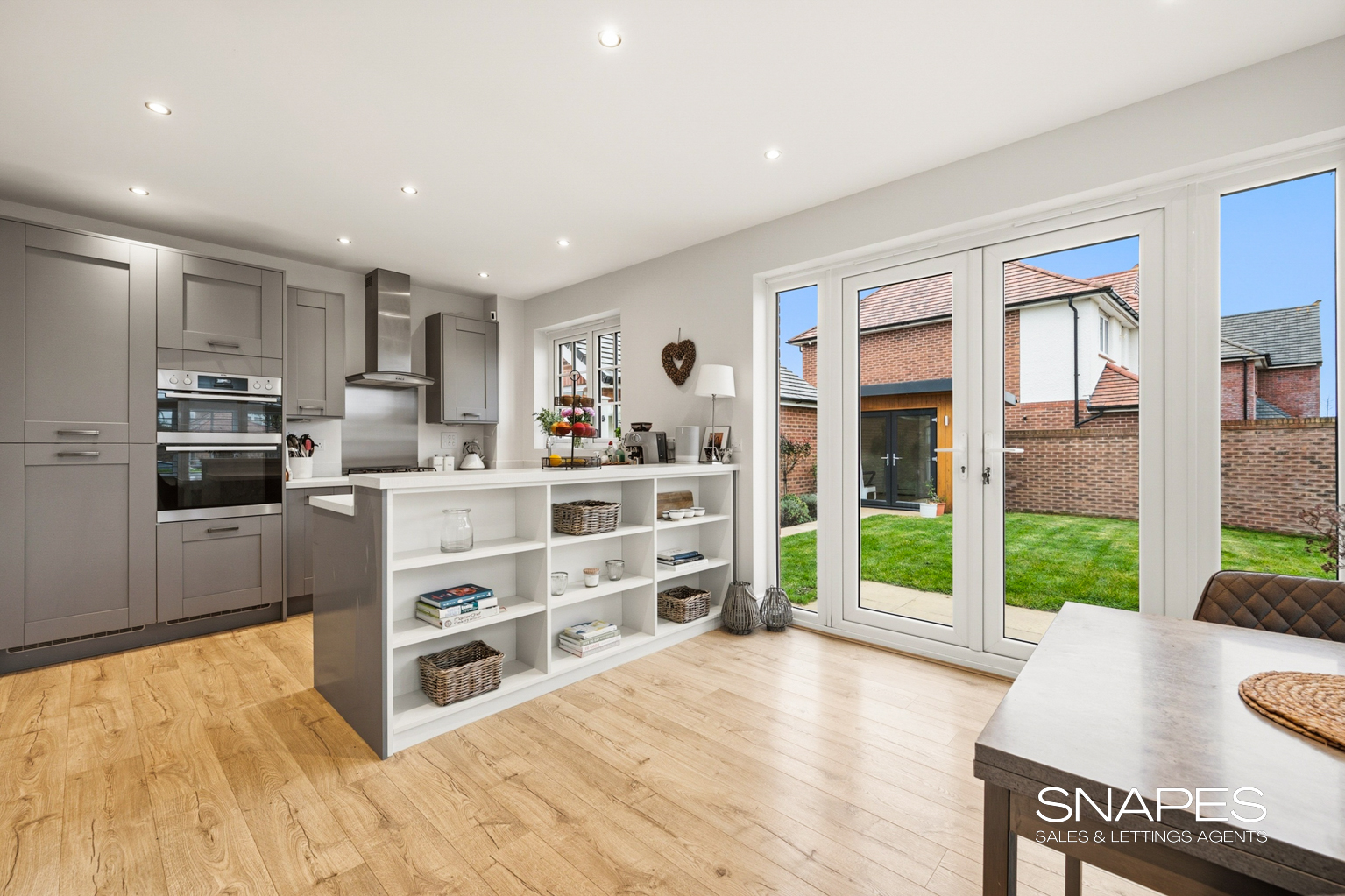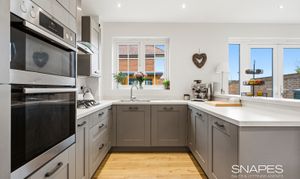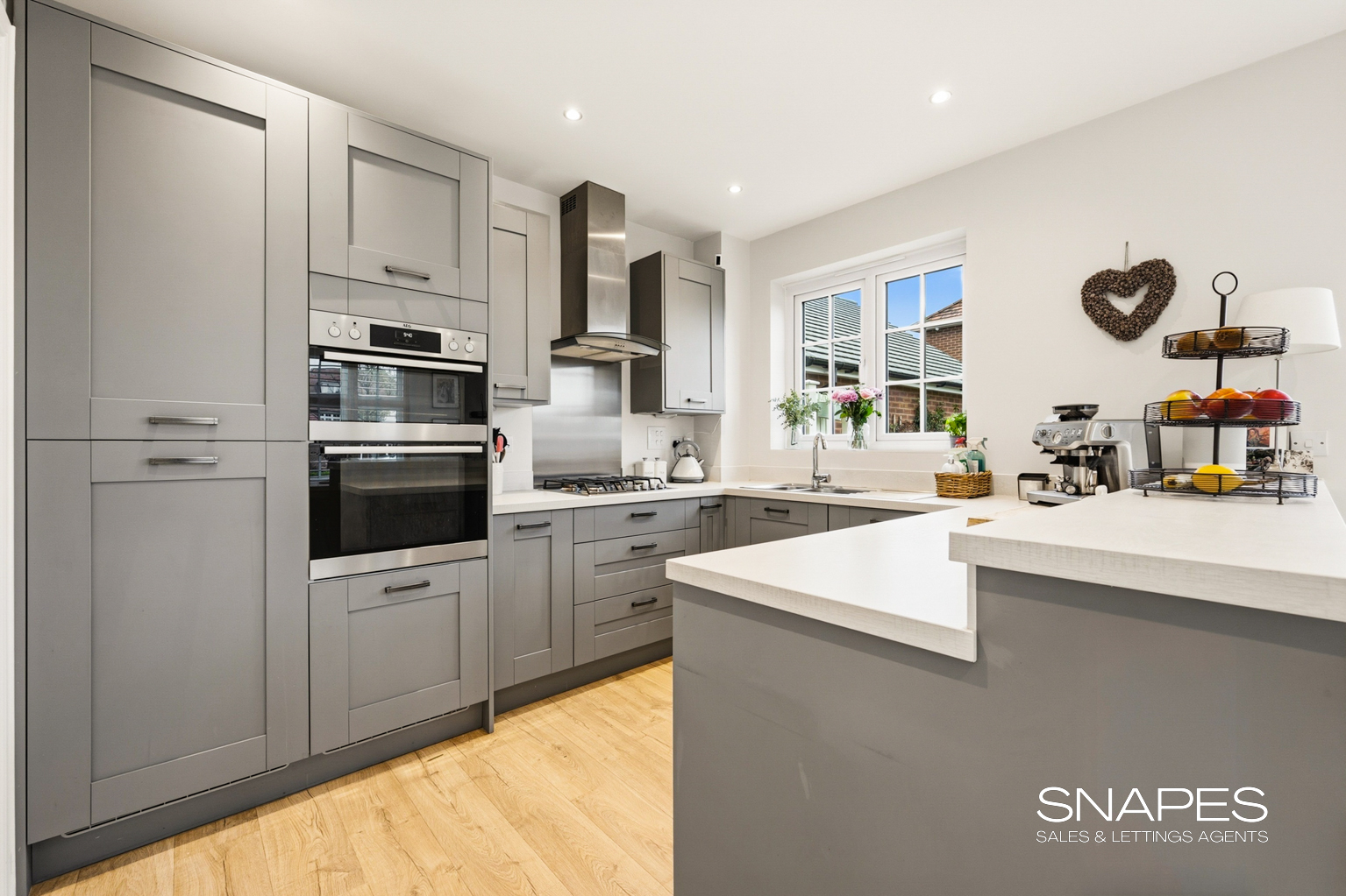 The open-plan kitchen and dining area forms the heart of the home—perfect for both everyday living and entertaining. The kitchen is fitted with an extensive range of modern units, offering a well-designed and highly functional space, with ample room for dining and more informal seating if desired. A separate utility room further enhances practicality, keeping laundry and household tasks neatly separate from the main living areas.