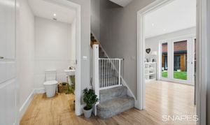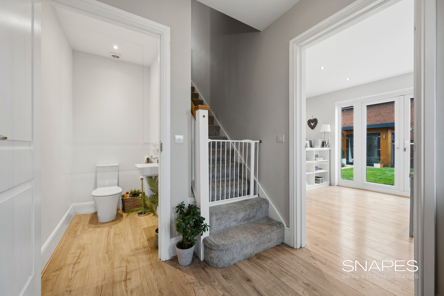 The property is entered via the front door into a welcoming entrance hall. From here, there is access to a convenient downstairs WC, fitted with a low-level WC and wash hand basin—one of three toilets within the home, ideal for family living and guests alike.
