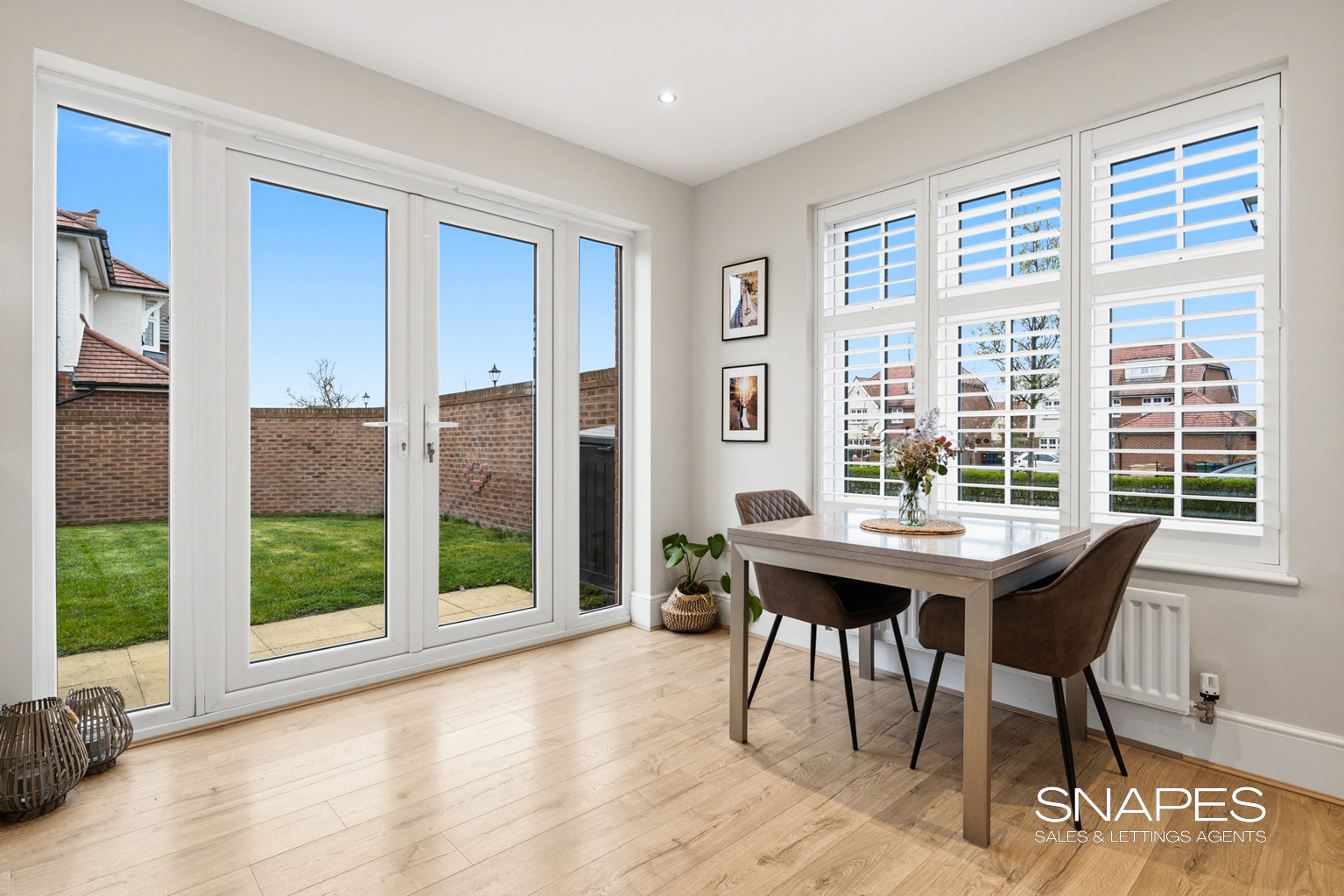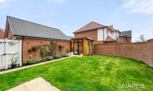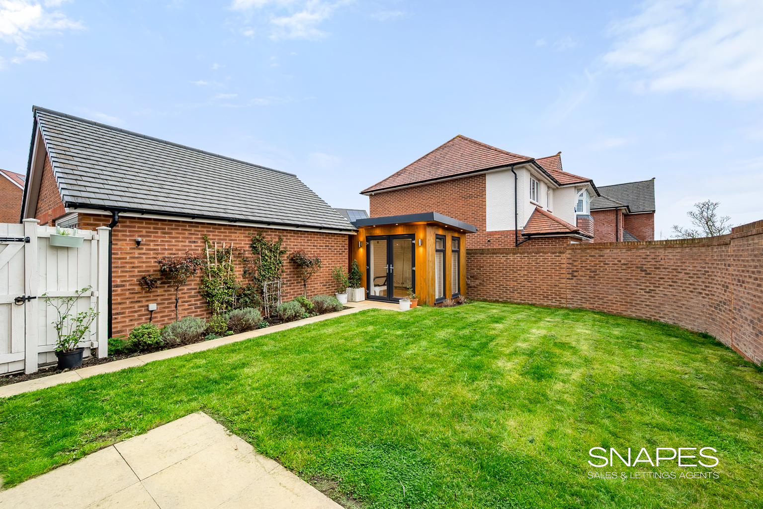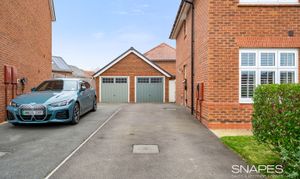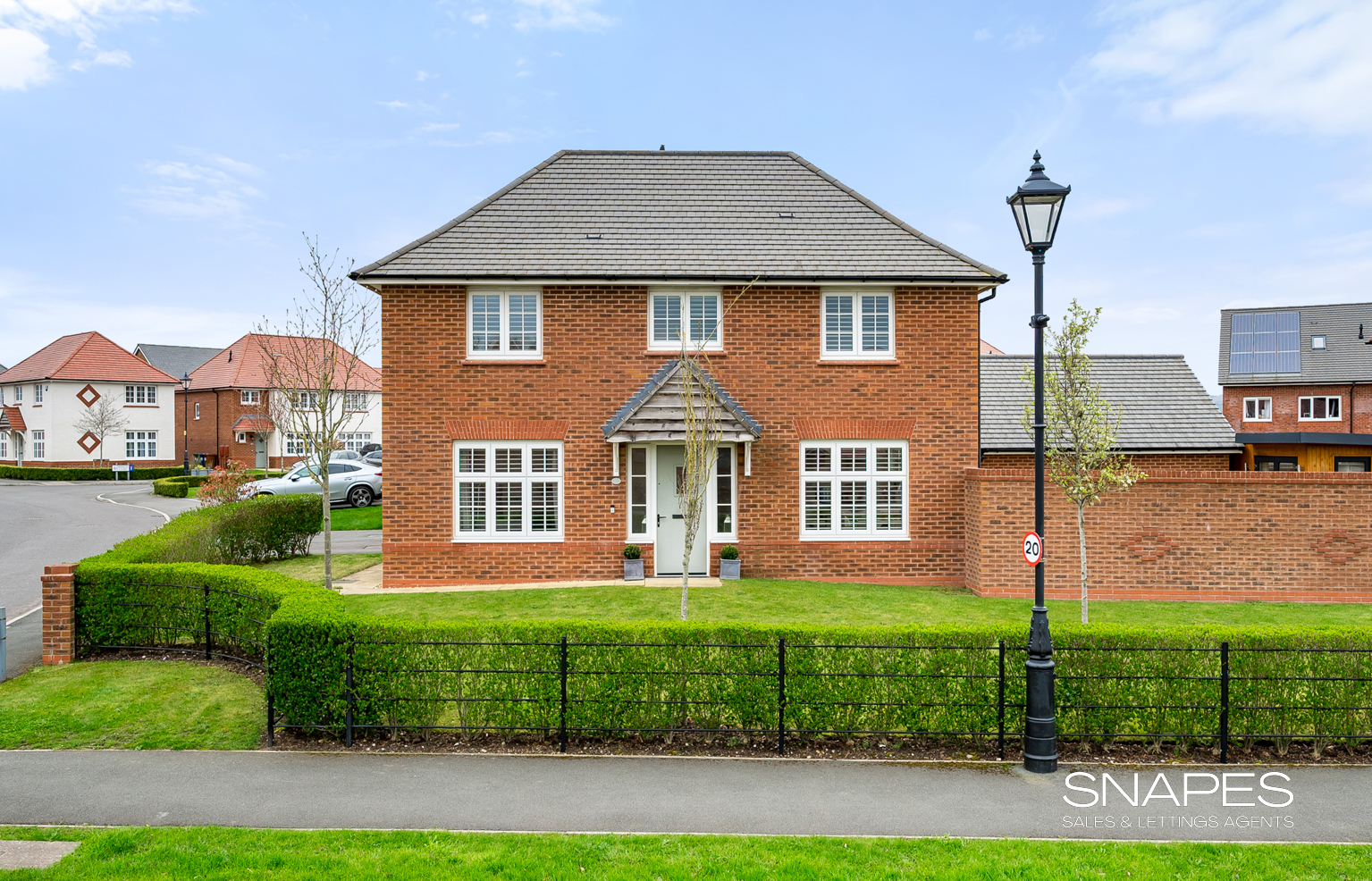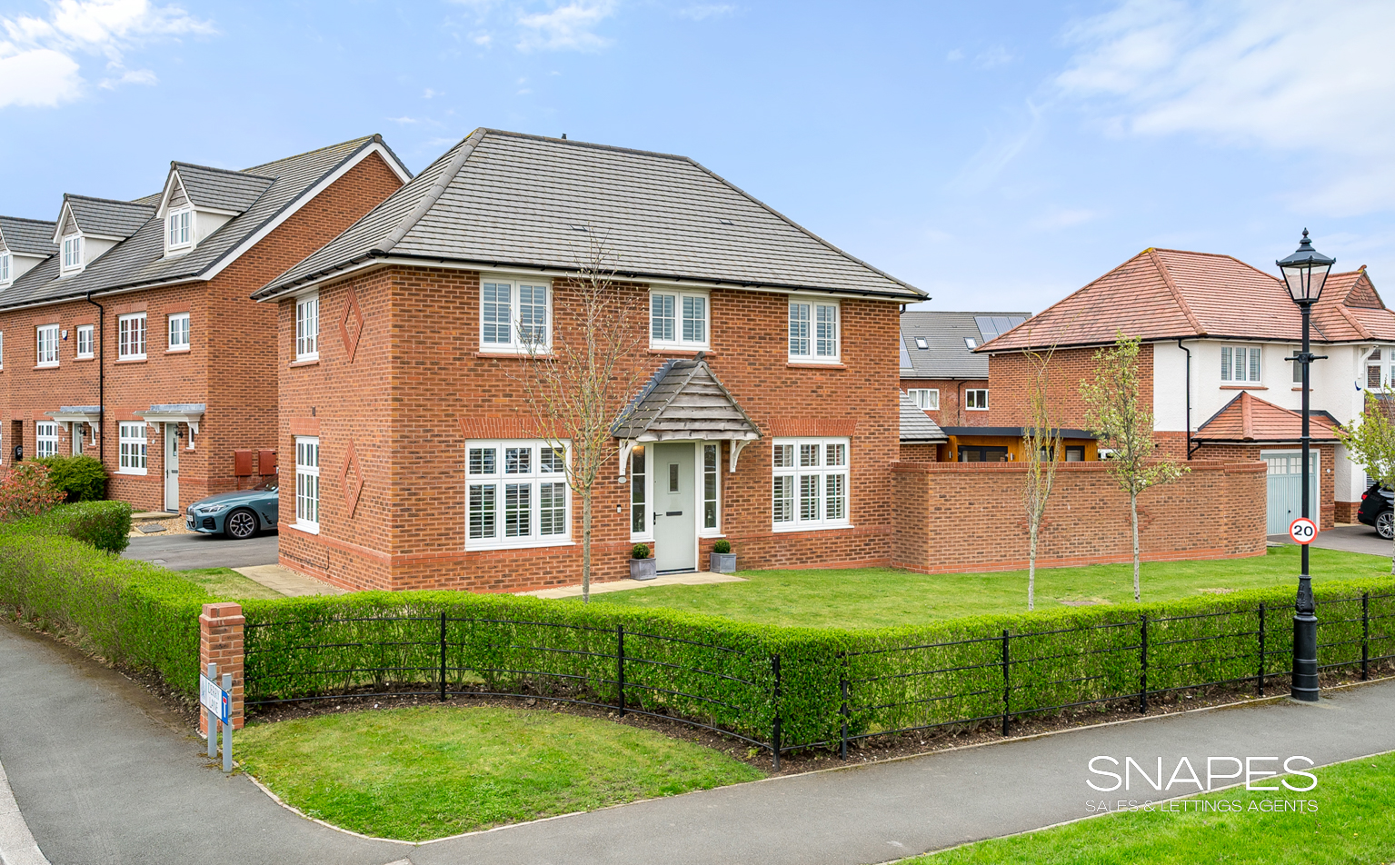 The property occupies a superb position on the fringes of the development, enjoying a commanding corner plot. There is a driveway with EV charging point leading to a single garage, both providing ample parking.