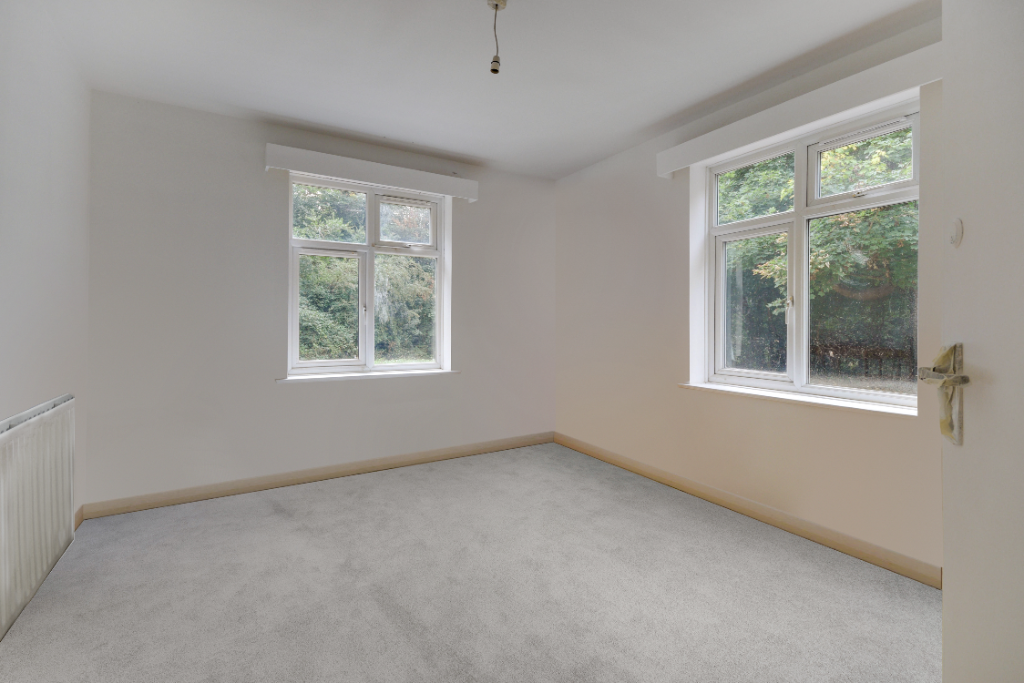 A large double bedroom at the front of the property features dual-aspect UPVC double-glazed windows, a soft grey carpet and a centrally heated radiator.