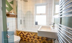 Fitted with an attractive modern white suite comprising low level WC, wash hand basin and panel bath with shower over. Double glazed window to front. Heated towel rail.