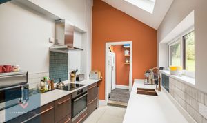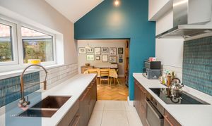 Fitted with a stunning modern kitchen with a range of base units with quartz work surface over and one and a half bowl sink with hose style mixer tap. There is an integrated dishwasher and integrated oven and hob with extractor hood over. Light is provided by a double glazed skylight and double glazed window to the side.