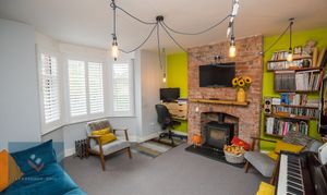 This attractive principal reception room boasts an exposed brick chimney breast with inset log burner for cosy winter evenings. The double glazed bay window to the front is fitted with built in shutters and there is also a central heating radiator.