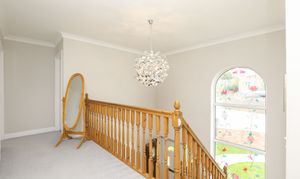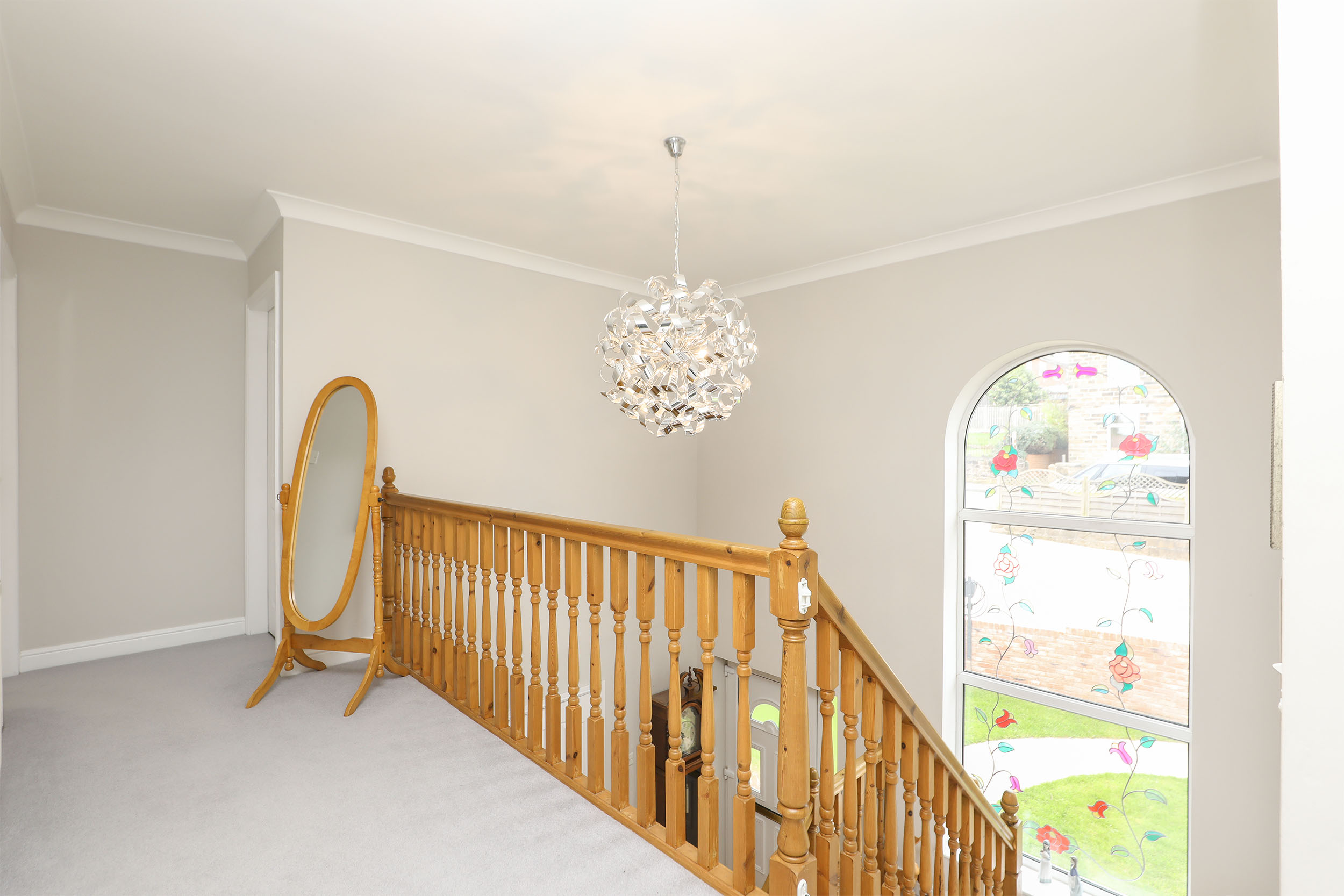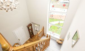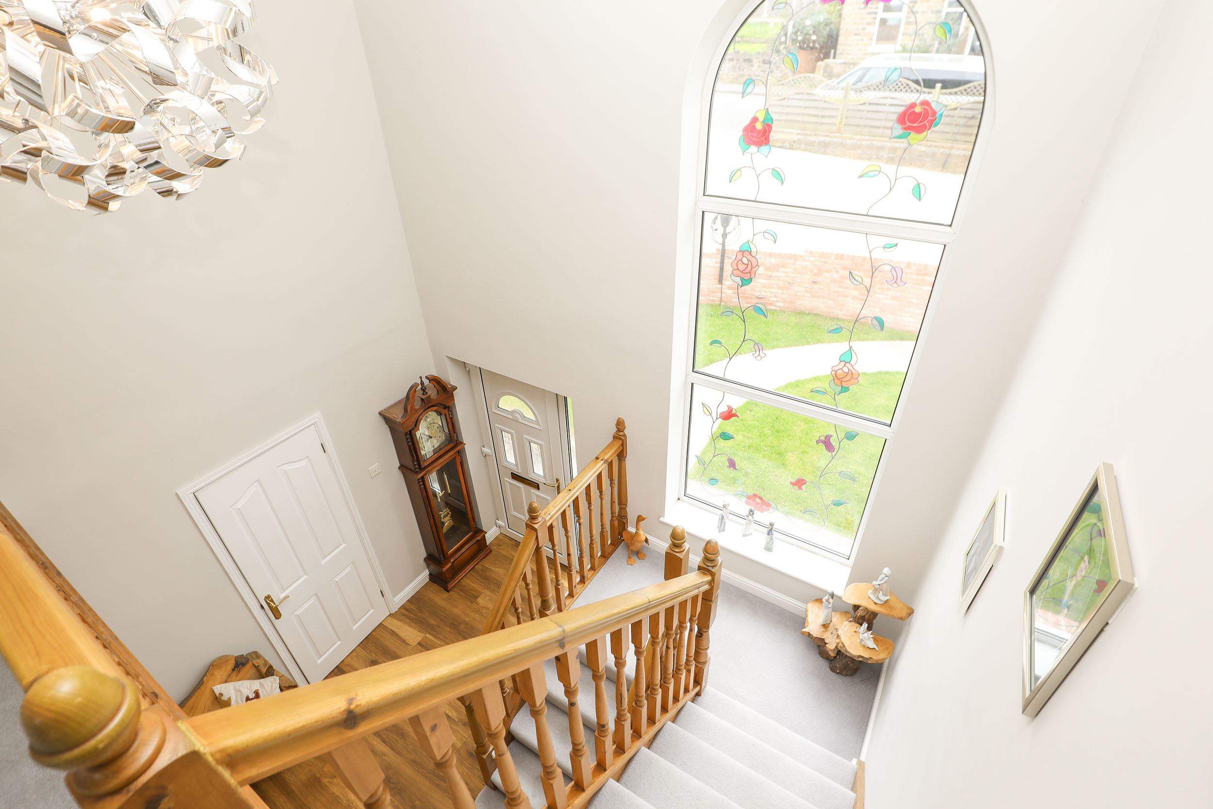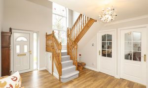 Upon entering the property, you are welcomed by a fantastic entrance hall that immediately creates a lasting impression. A striking feature window floods the space with natural light, showcasing the grand staircase and setting the tone for the quality and space found throughout the home.
