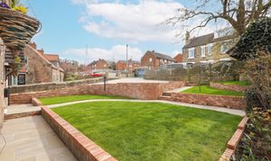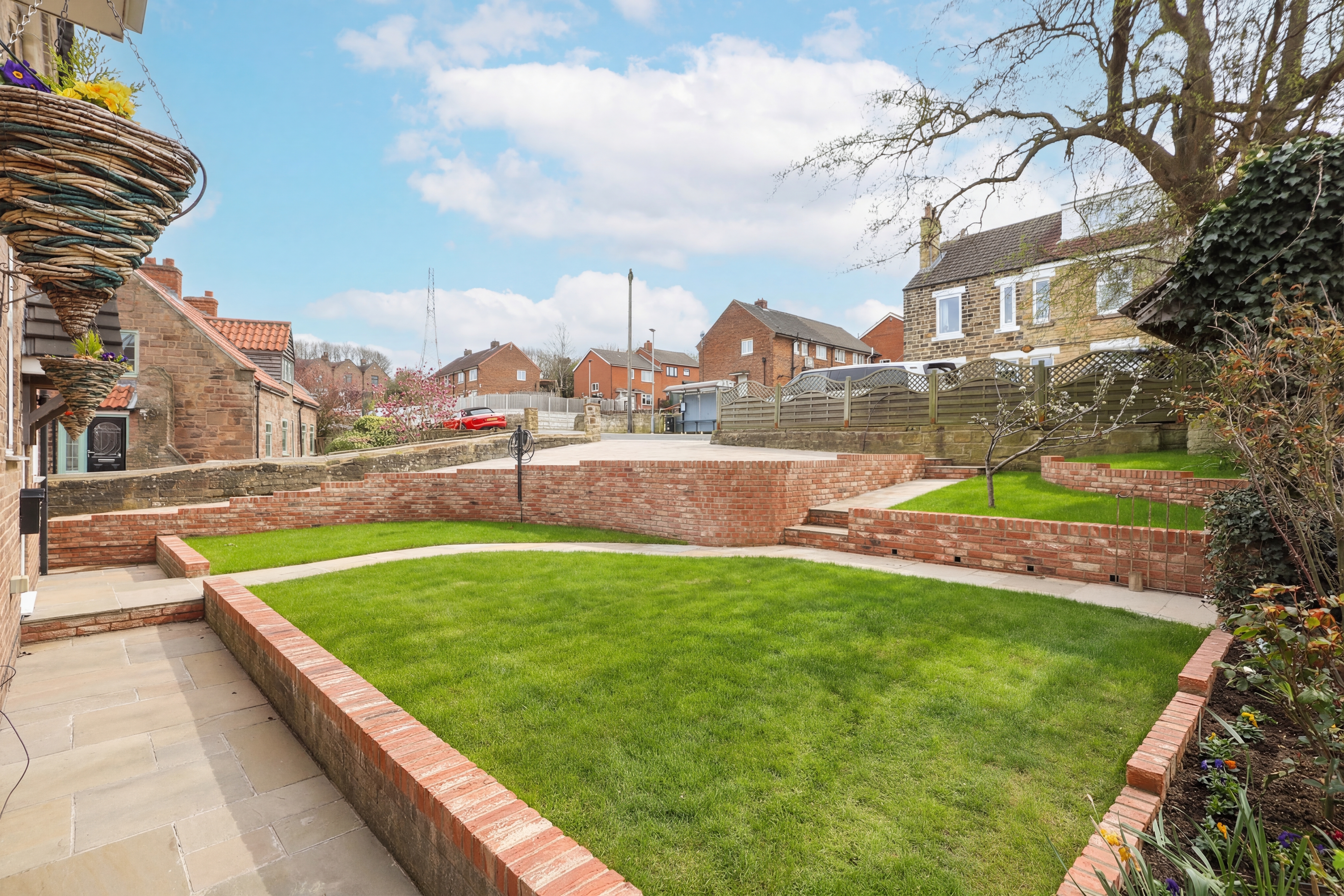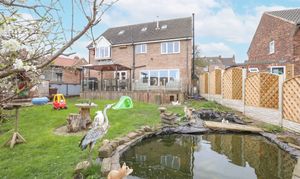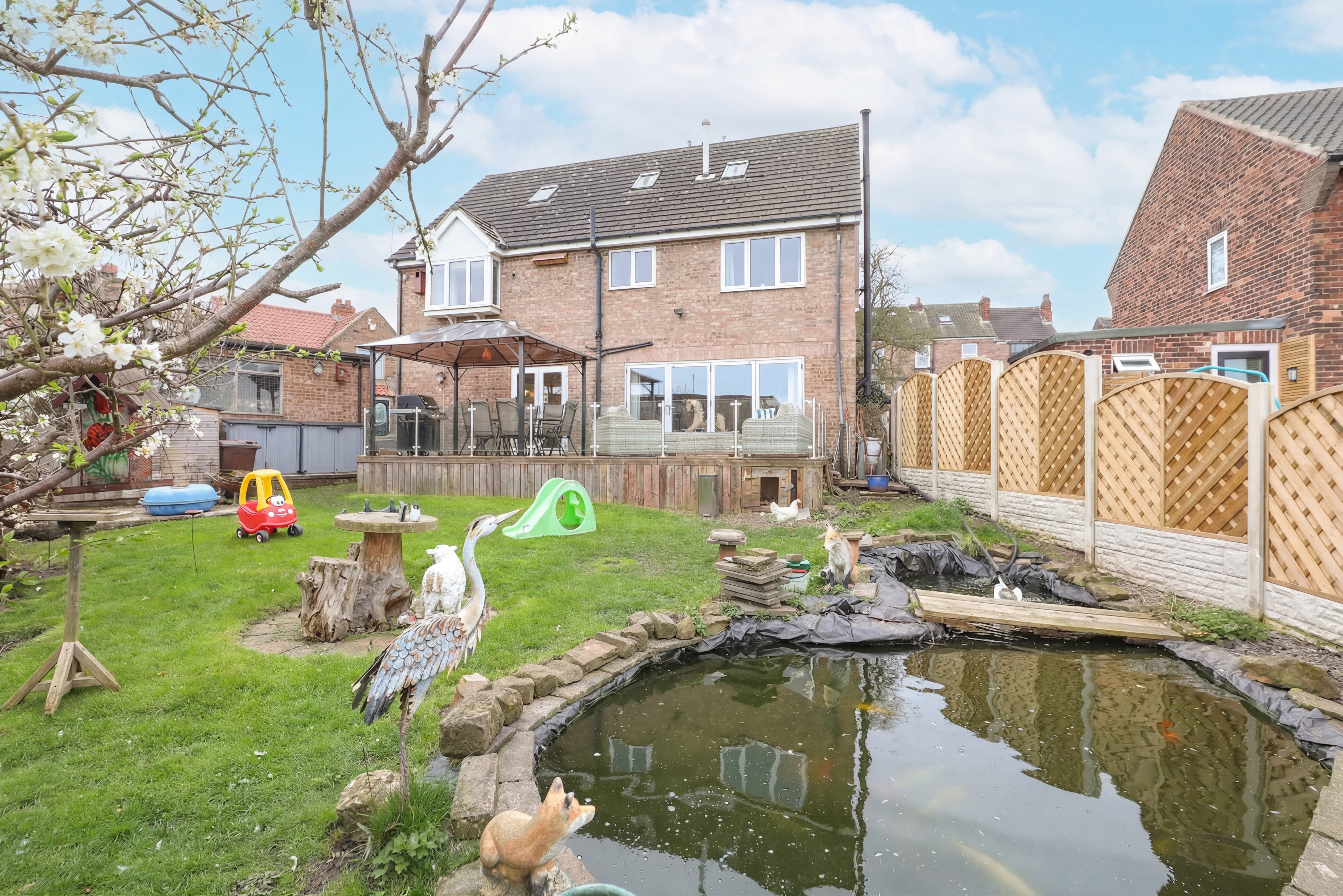 The rear garden is arranged across multiple levels. A decked seating area offers the perfect space for outdoor entertaining, with a charming pond and lawned garden, ideal for both families and those who enjoy outdoor living.