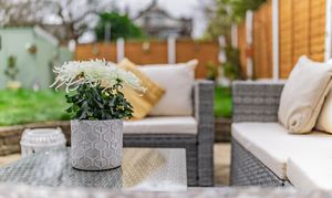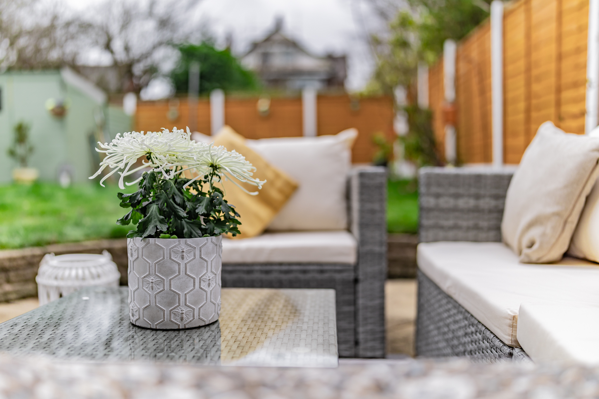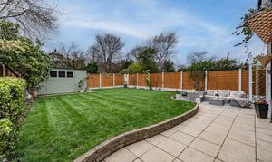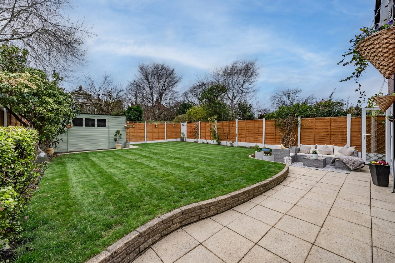 The garden is a generous and well-established outdoor space. The patio area provides a perfect spot for outdoor dining, while a raised lawn offers plenty of room for relaxing or family activities. The garden features mature planting including pyracantha and rhododendron, a small apple tree, and a wooden potting shed positioned at the far corner. There is also useful gated side access with a practical area for bin storage.