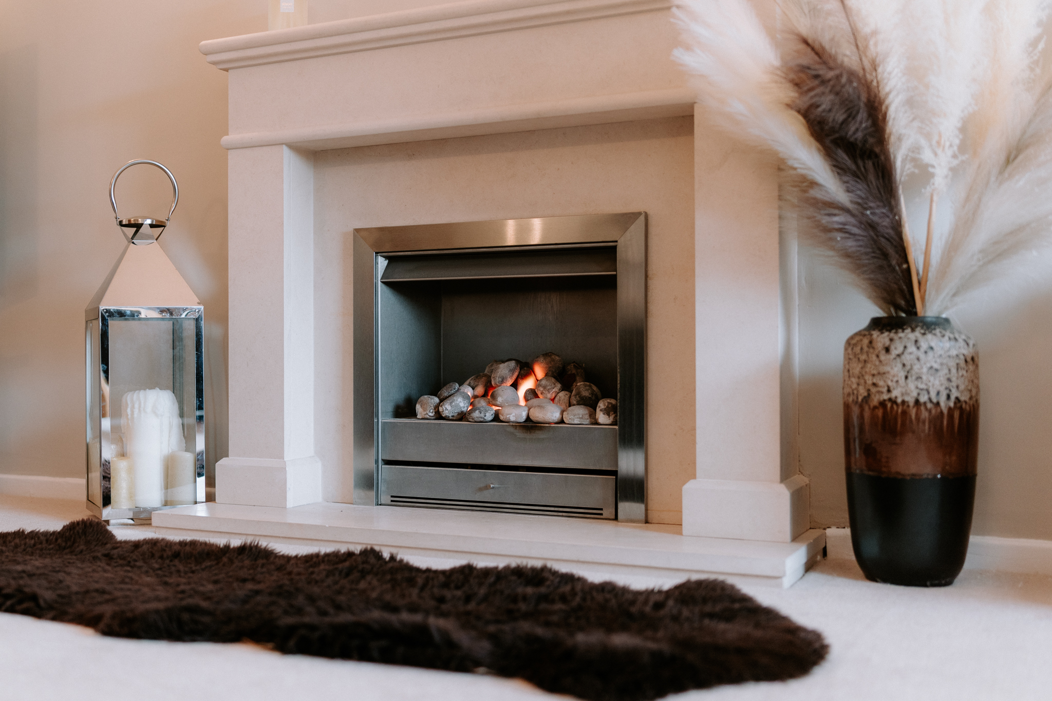 A storm porch with a front-facing window leads to a glass-panelled front door, opening into a welcoming hallway finished with quartz floor tiles. From the hall, a glass door leads into the main living room on the right. This is a warm and comfortable space with a large front-facing window allowing light to pour in, and a gas fire with a stone surround providing an attractive focal point. Double glass doors connect the living room to the dining room, allowing the rooms to flow together beautifully while still offering flexibility when entertaining or relaxing.