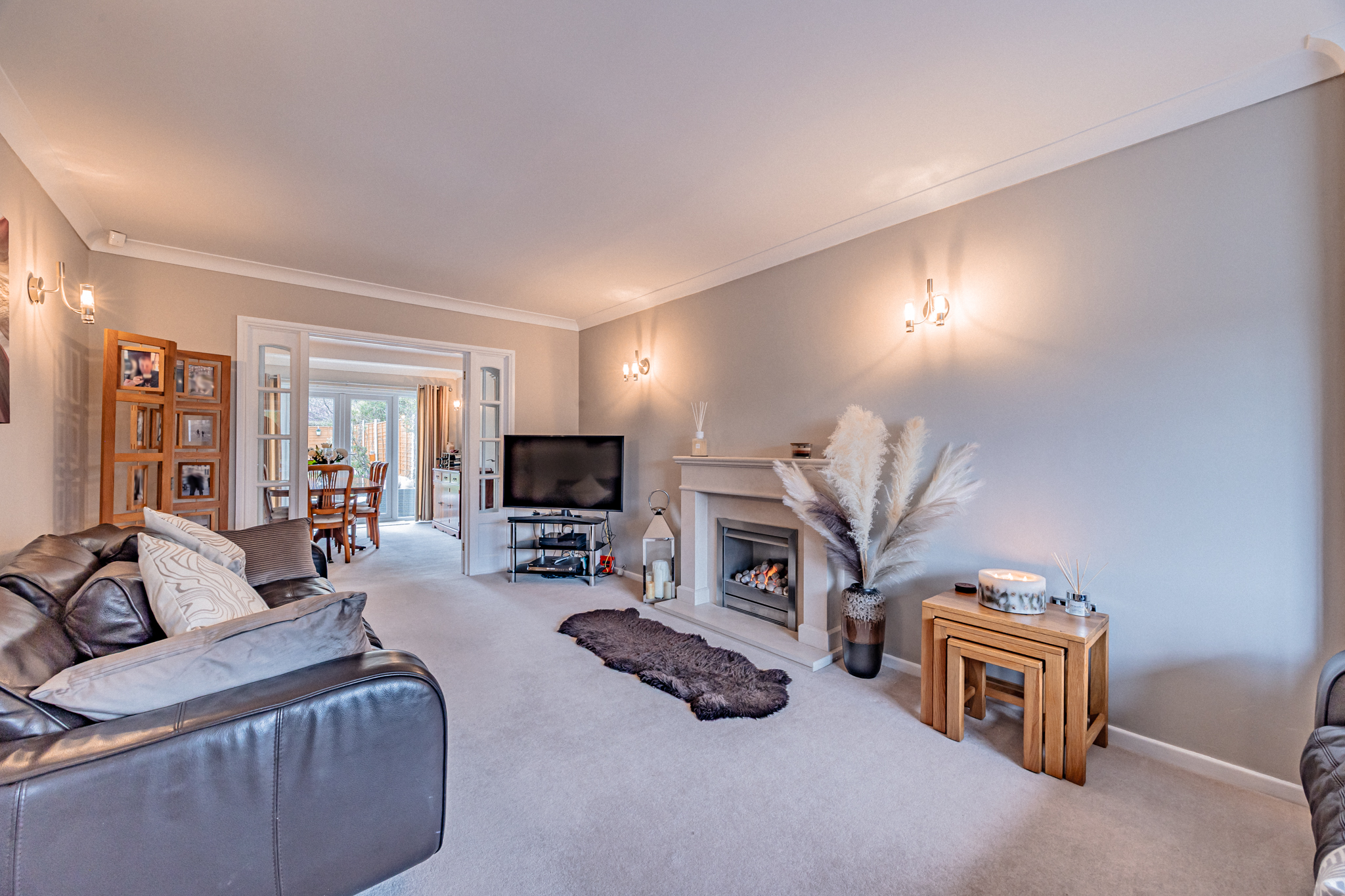 - Bright living room with large window, gas fire and double doors opening to the dining room