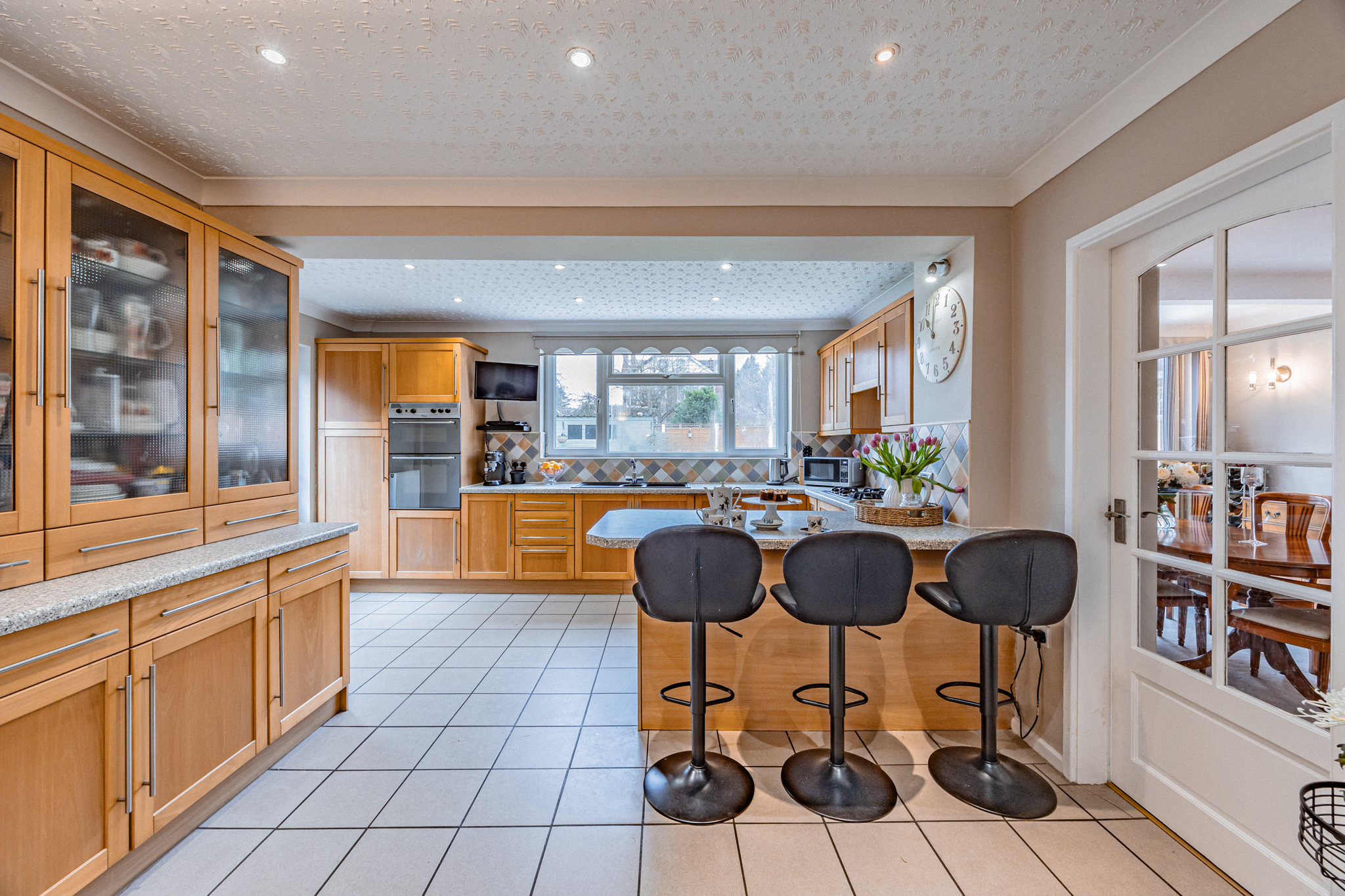 The kitchen is both spacious and sociable, with a tiled floor and a large window overlooking the garden, with the sink positioned beneath to enjoy the view outside. It is fitted with Whirlpool integrated fan-assisted double ovens, a Whirlpool gas hob, and a full-size Bosch dishwasher, along with an under-counter fridge and freezer. A breakfast bar comfortably seats four, creating a natural hub for everyday living, and there is additional space for soft seating and even a television in the corner, making this a relaxed and versatile family space. A half-glazed door provides direct access to the side of the house.
