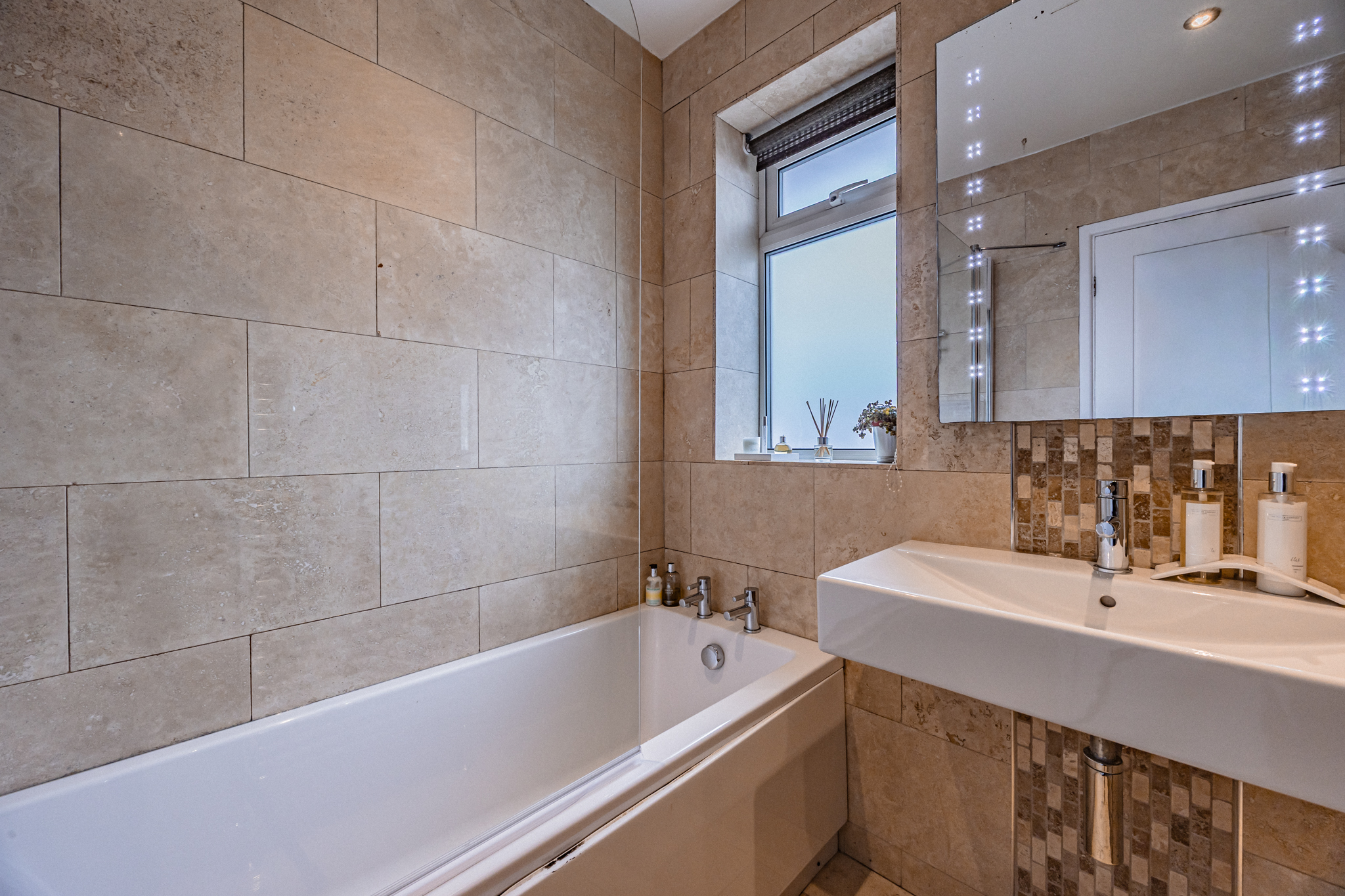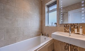 The family bathroom is located at the front of the property and is fully tiled, with spotlights, a window to the front and a bath with shower over. There is also a separate WC on the landing, along with built-in storage straight ahead at the top of the stairs and an airing cupboard. The loft is fully boarded, providing excellent additional storage.