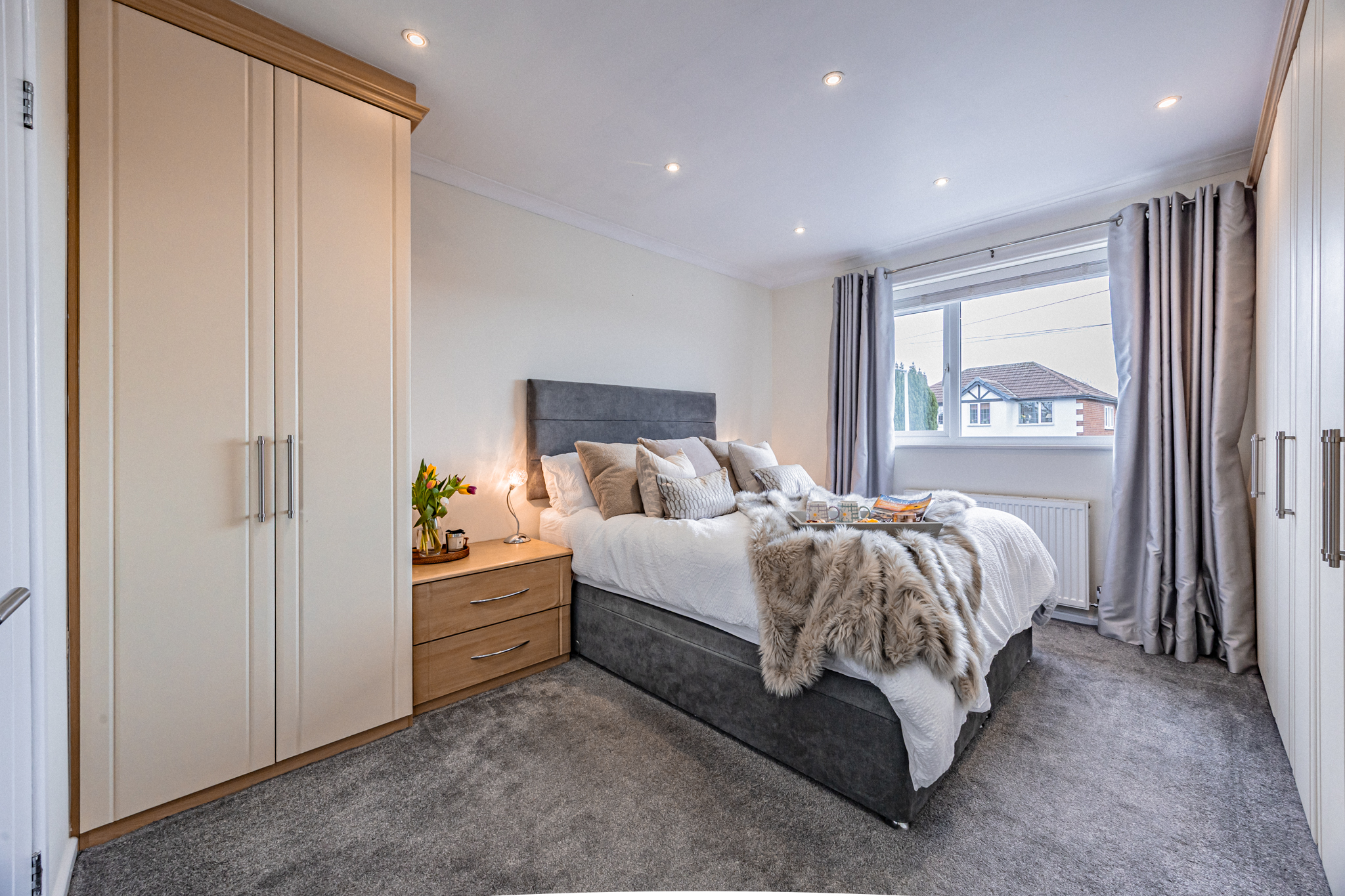 The staircase, with its metal wrought iron balustrade and wooden handrail, leads to the first floor, with carpet running up the stairs and onto the landing. The principal bedroom sits at the front of the property and features a large window, ceiling spotlights, fitted wardrobes across two walls, and fitted bedside tables designed for a king-size bed. It also benefits from an ensuite shower room with a shower and sink with storage.