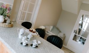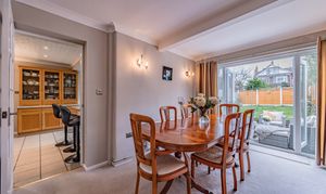 The dining room enjoys a lovely connection with the garden, with French doors opening directly onto the patio area. This creates an easy indoor-outdoor feel during the warmer months and makes the room ideal for family gatherings or entertaining guests.