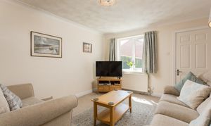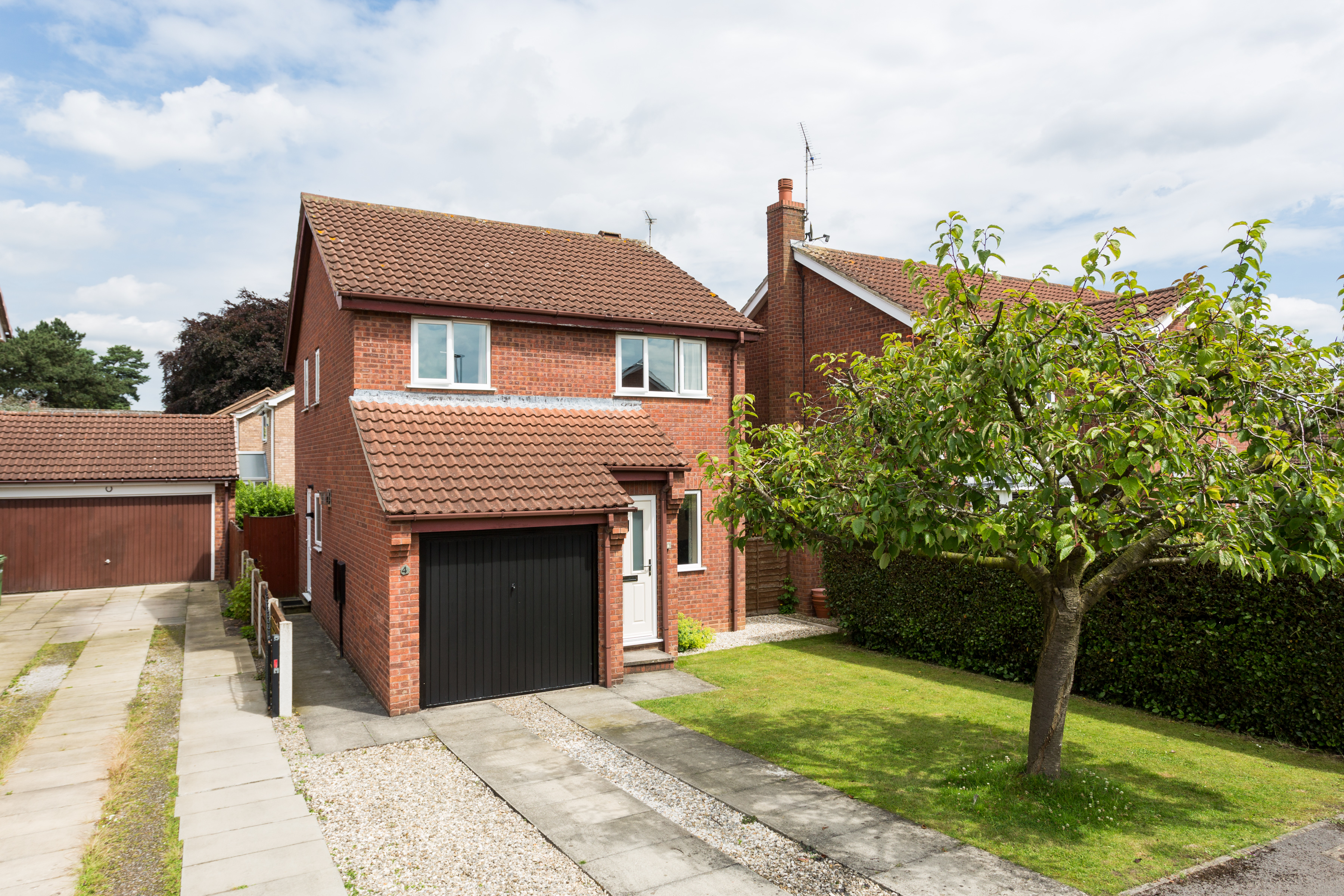 A drive which allows for off-street parking leads to an integrated garage and a gate to the side gives access to the rear garden. A pathway leads to the part glazed, composite front door and a small lawned area with mature shrubs and a Cherry tree add a splash of colour in spring time.