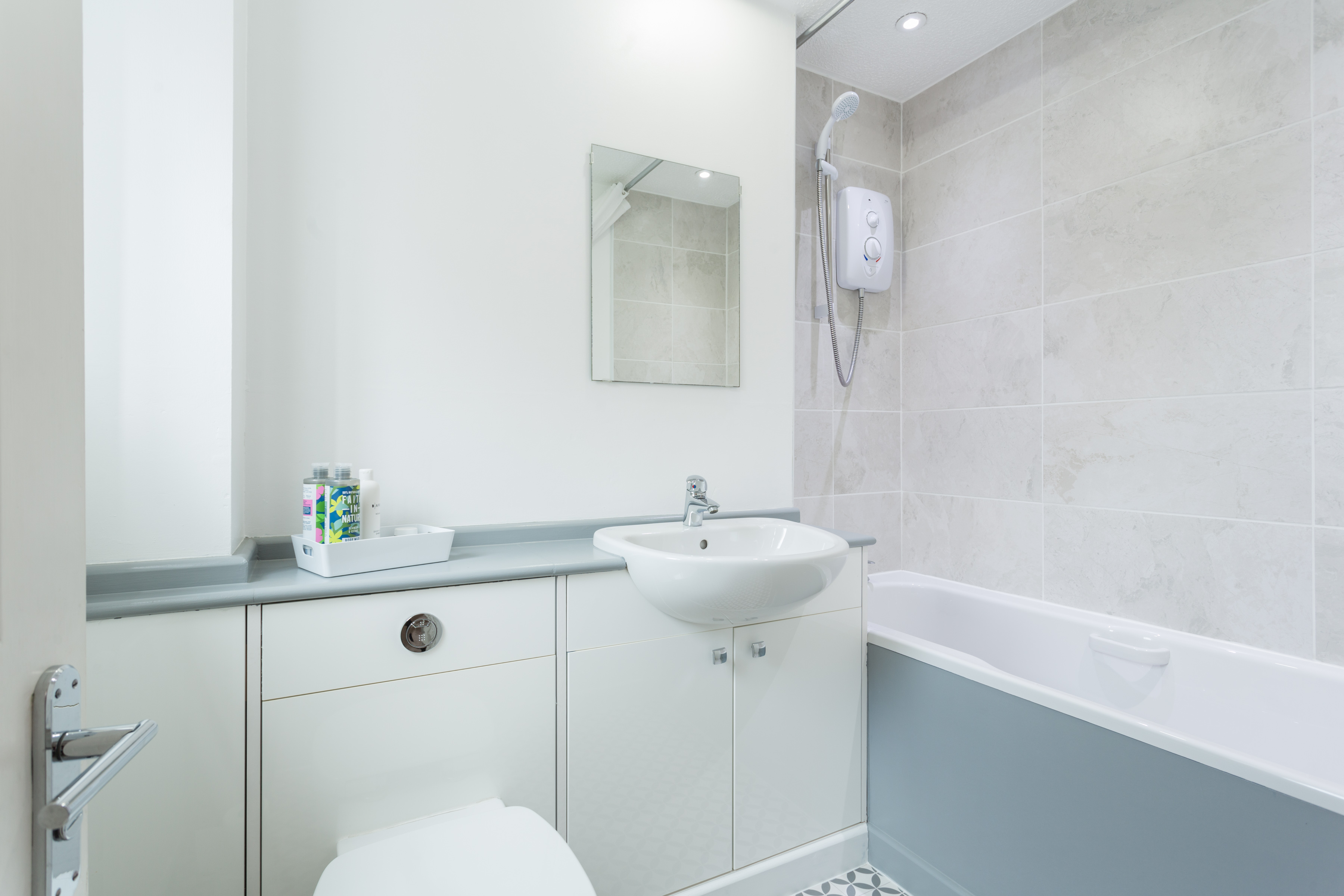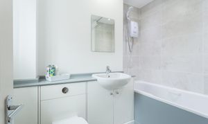 The house bathroom has a white three piece suite comprising bath with electric shower over and a wash hand basin with mixer taps and low-level W/C set within a vanity unit. Finished with modern pale grey tiled walls, contrasting vinyl flooring, spotlights and a frosted window to allow light and ventilation.
