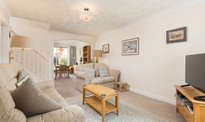 The lounge/diner offers a window to the front elevation and patio doors to the rear. This room is generous enough to accommodate a seating area, a formal dining arrangement and other items of free-standing reception furniture. The neutral décor adds a tranquil feel to this home and the cream carpet continues throughout. A spindled staircase has been decorated to co-ordinate with the room and gives access to the first-floor accommodation.