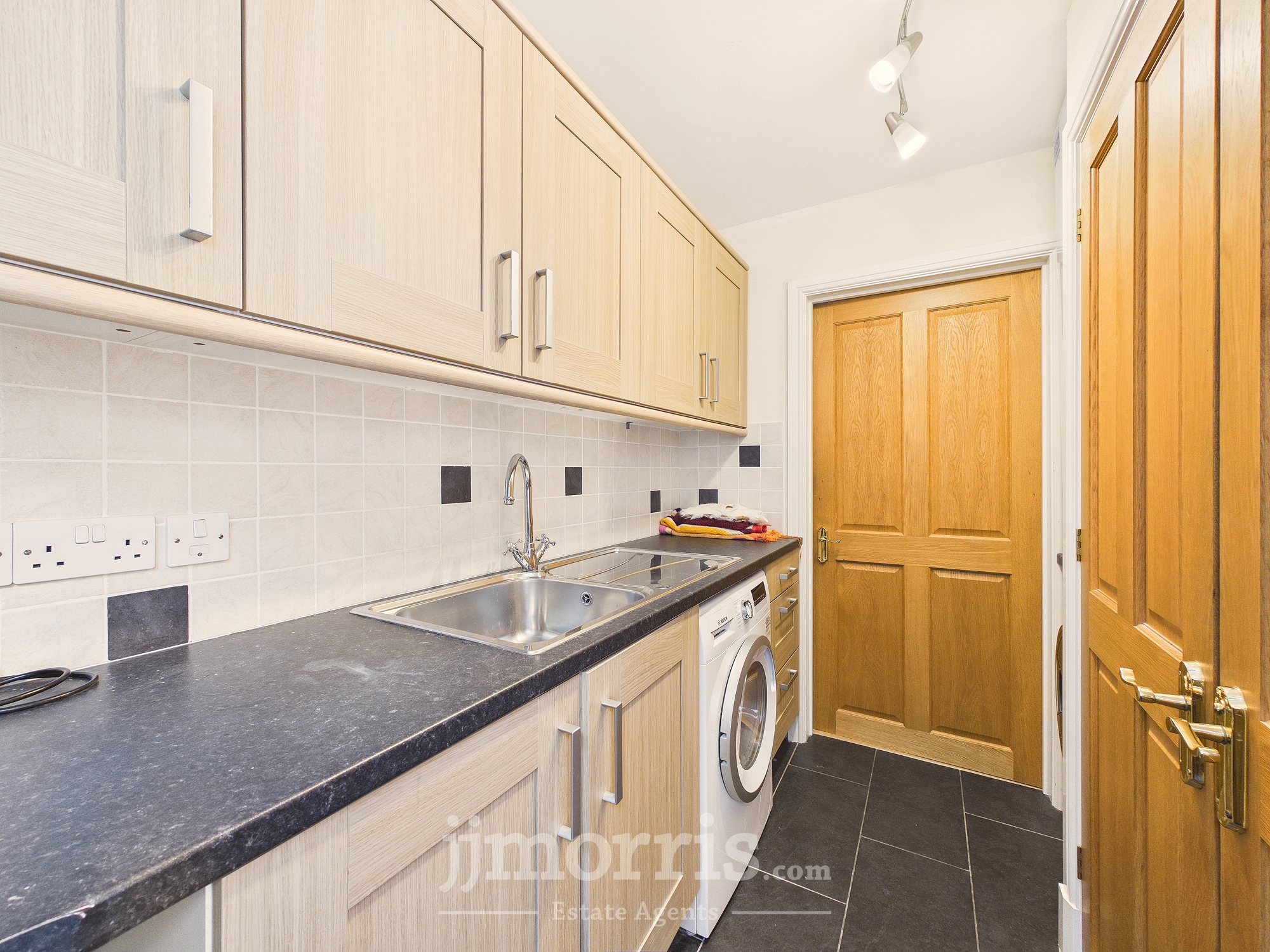 Range of wall and base units with worktop surfaces, stainless steel sink unit with mixer tap over, storage cupboard, tiled flooring, uPVC door to garden.