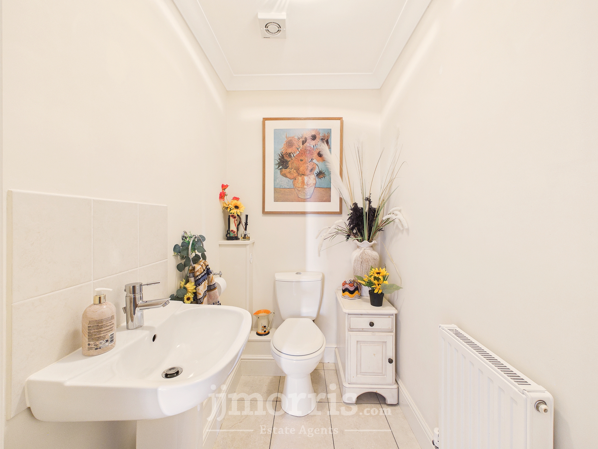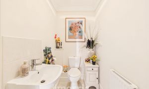 WC, hand wash basin with tiled splashback, tiled flooring, radiator, coved ceiling.