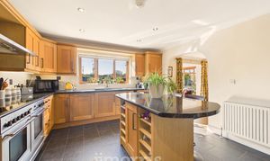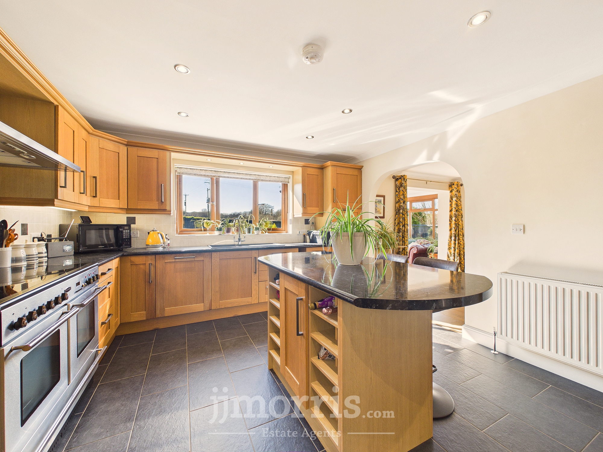 Having a range of wall and base units with marble effect worksurface over, Range Master cooker with extractor unit over, double sink with stainless steel mixer tap over, kitchen island with marble effect worktop with storage unit and built-in wine rack under, tiled floor, uPVC double glazed windows, radiator. Archway to:-