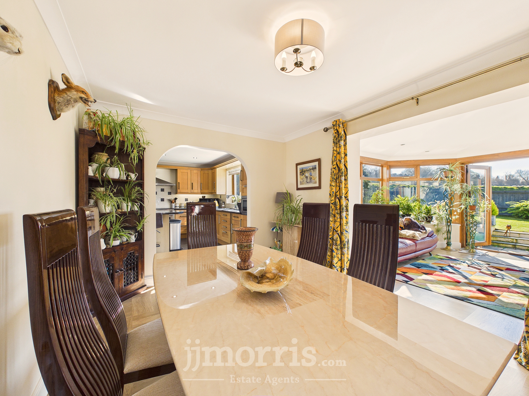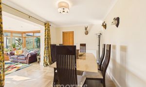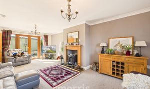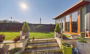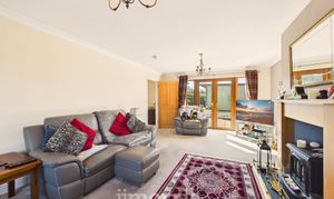 Wood effect laminate flooring, radiator, uPVC double glazed windows and double doors opening to rear patio area.