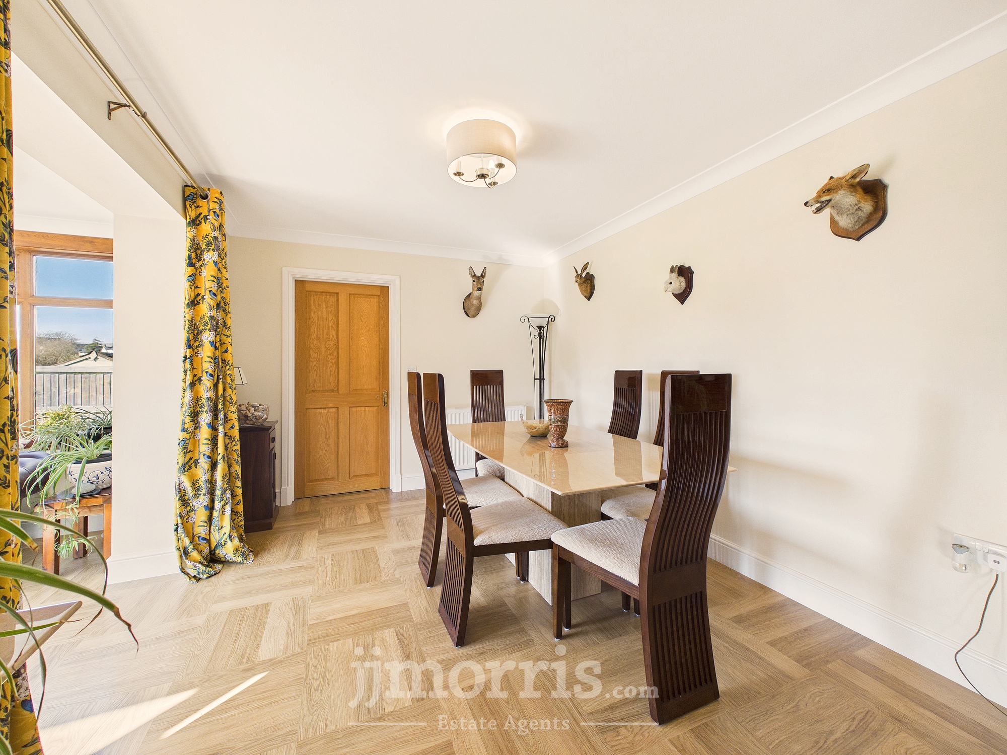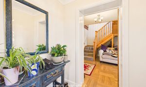Wood effect laminate flooring, radiator, coved ceiling.