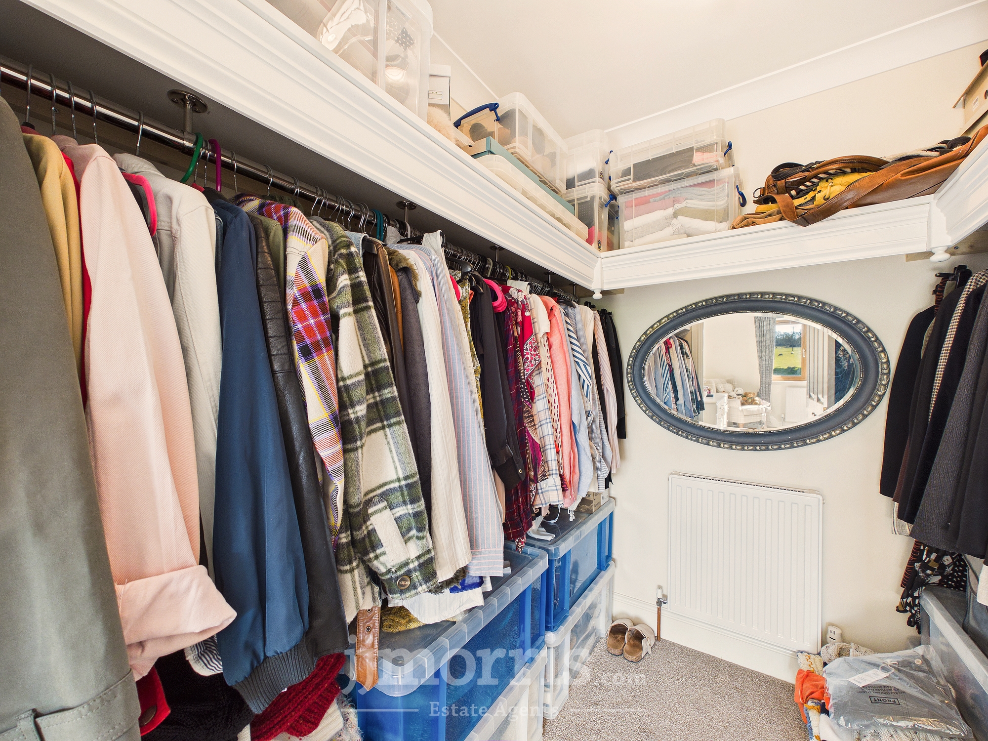 Radiator, clothes rail with overhead storage.