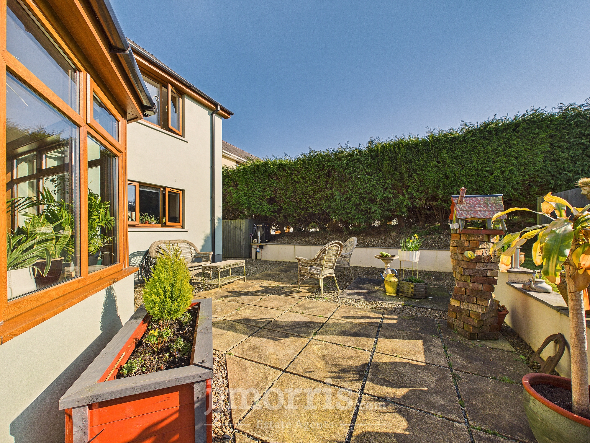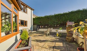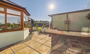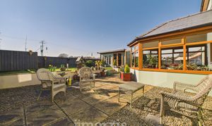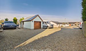 Gravel driveway with ample parking for several vehicles, garage with roller door and uPVC personnel door. To the rear there is a paved patio area and steps to lawned area with summer house.