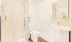 Shower, WC, hand wash basin, tiled floor and walls.