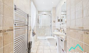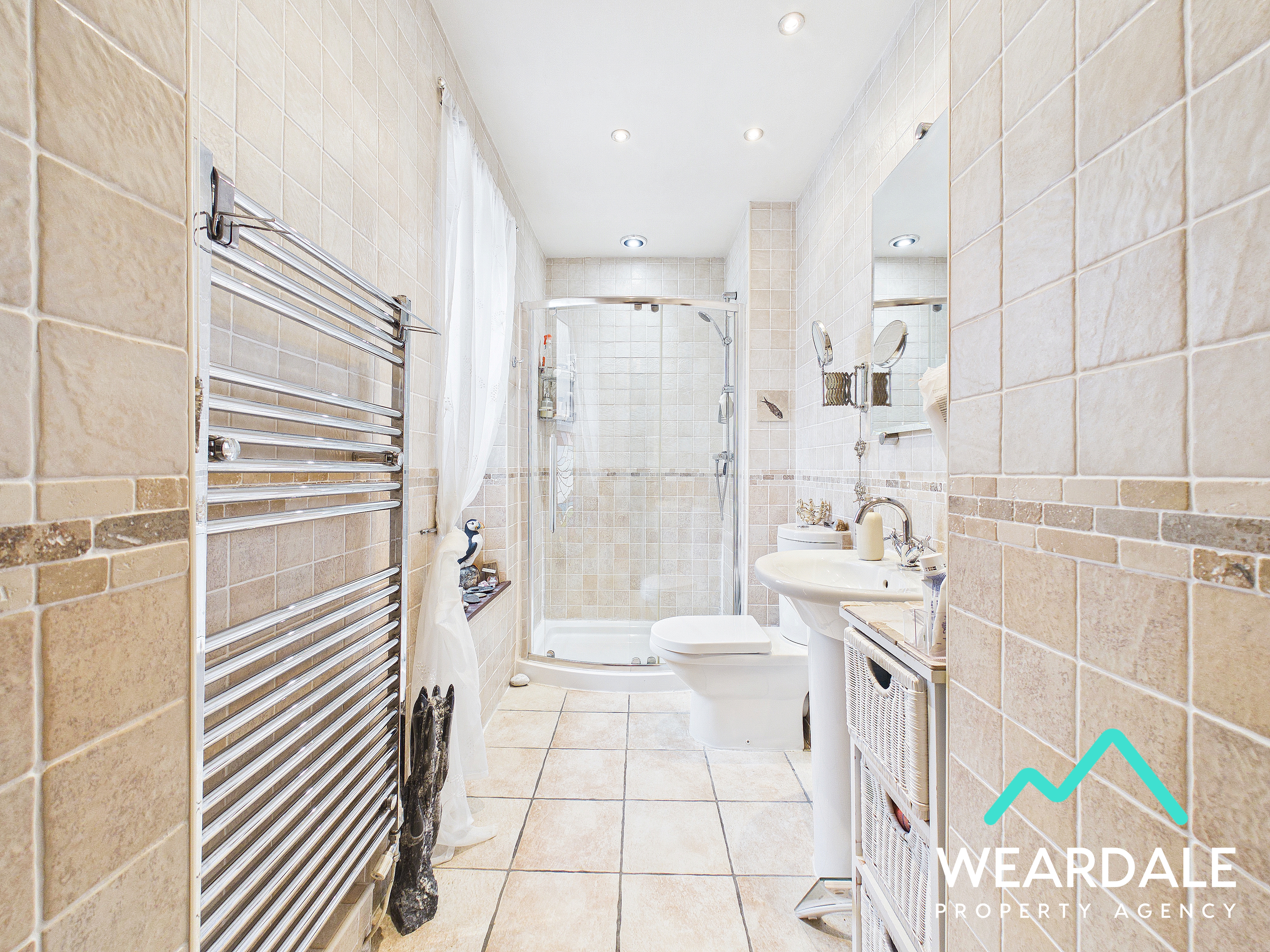 - Positioned to the rear of the property and accessed via one step down from the landing - Double-glazed uPVC window with frosted pane to the Northern aspect - Tiled flooring - Fully tiled walls - Walk-in shower cubicle with sliding glass door, fully tiled enclosure, and mains-fed shower - WC - Hand-wash basin - Ceiling spotlights - Vertical heated towel rail - Extractor fan
