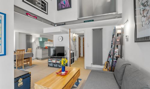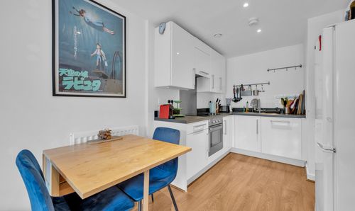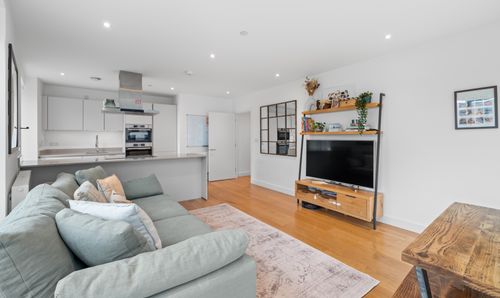 Accommodation comprises entrance hall with inbuilt storage, leading into the open plan reception/kitchen/diner with ample space for relaxing, entertaining and dining. The kitchen area has been newly updated, comprising a sleek range of matching white fronted wall and base units with work surfaces incorporating inset sink unit, induction hob with overhead extractor, electric oven, and further range of integrated appliances. There are two well proportioned double bedrooms, with en-suite shower room to the principal bedroom, plus a family bathroom with modern bath suite.